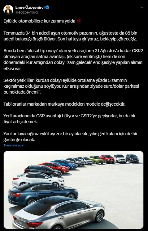 Emre Özpeynirci, sosyal medya üzerinden yaptığı açıklamalarda, eylül ayında araç fiyatlarına yüzde 5 oranında bir zam geleceğini öngördü.