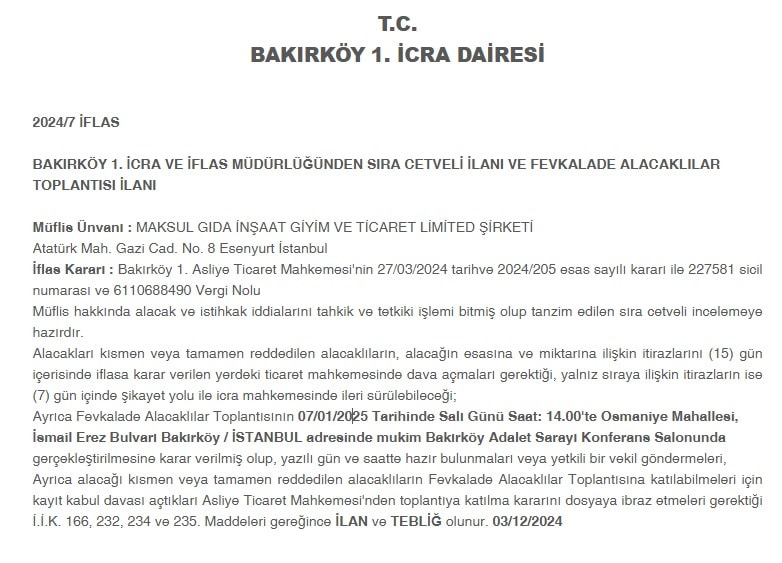 Bakırköy 1. İcra Dairesi, Maksul Gıda’nın alacaklıları için bir toplantı düzenleyeceğini duyurdu.