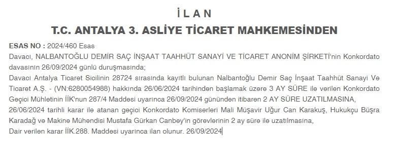 Şirket, mahkemeye yaptığı başvuruda geçici mühlet süresinin uzatılmasını talep etti. Mahkeme ise şirkete 2 aylık geçici mühlet verdi ve 3 kişilik konkordato komiseri heyeti atadı.