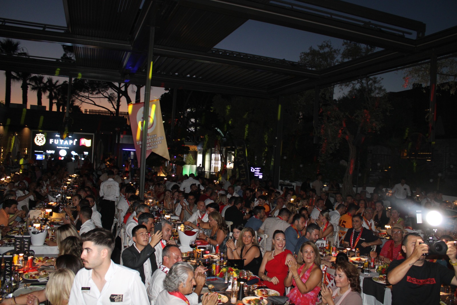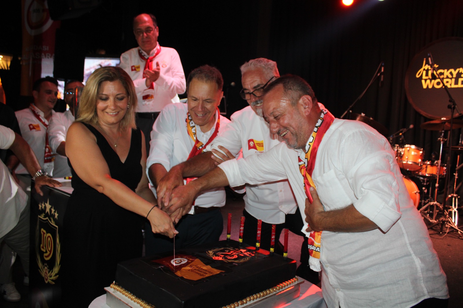 Kuşadası Galatasaray Taraftarlar Derneği’nin düzenlediği, Galatasaray’ın 25.’nci Şampiyonluk gecesi Lucky’s Club’ta gerçekleşti. Organizasyona özel olarak, sarı kırmızılı taraftarlar için getirilen Süper Lig ve Ziraat Türkiye kupasının de sergilendiği geceye Galatasaray Spor Kulübü Baş Hukuk Müşaviri Petek Akyüz Arslan, Kuşadası Kaymakamı İbrahim Keklik, Kuşadası Belediye Başkan Yardımcısı Çağlayan Erdem, Kuşadası Galatasaray Taraftarlar Derneği Başkanı Barış Şalbaş, Ticaret Odası Başkanı Serdar Akdoğan ve yönetim kurulu üyeleri, dernek üyeleri ve kalabalık bir taraftar topluluğu katılım gösterdi. Gecede, taraftarlar, şampiyonluk kupaları ile bol bol fotoğrafı çektirme imkanı buldu.