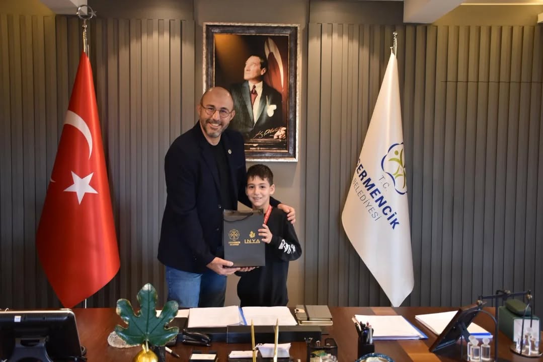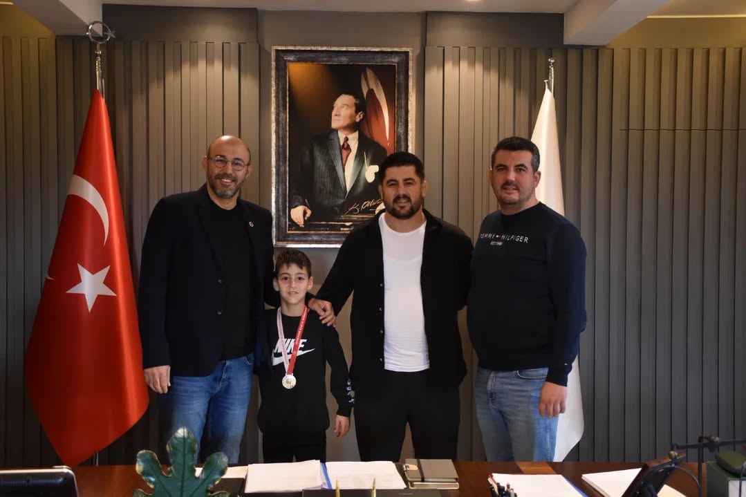 Altın madalya ile Germencik’in gururu olan Berzan Arslan, babası ve aynı zamanda antrenörü olan Hakan Arslan ile birlikte Germencik Belediye Başkanı Burak Zencirci’yi makamında ziyaret etti. Başkan Zencirci, minik şampiyonu tebrik ederek ödüllendirdi.