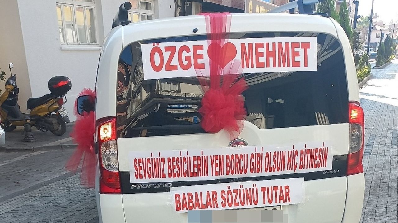 Germencik’in Hıdırbeyli Mahallesi’nde yaşayan besici Mehmet Horzum, hayatını Sevgi ile birleştirdi. Genç çift, en mutlu günlerinde kullandıkları düğün arabasında ise dikkat çeken bir mesaja yer verdi. Düğün arabasının arkasında yer alan “Sevgimiz besicilerin yem borcu gibi olsun, hiç bitmesin” yazısını gören vatandaşlar hem şaşırdı hem de gülümsedi.