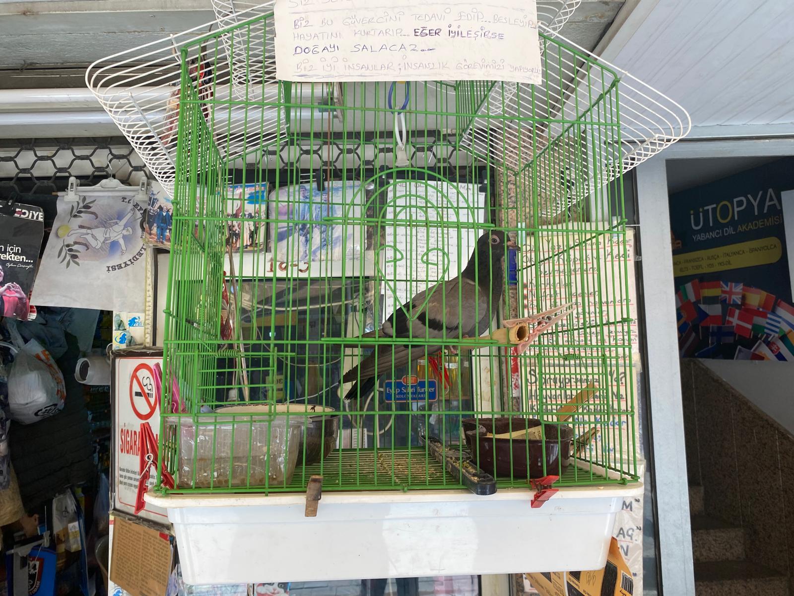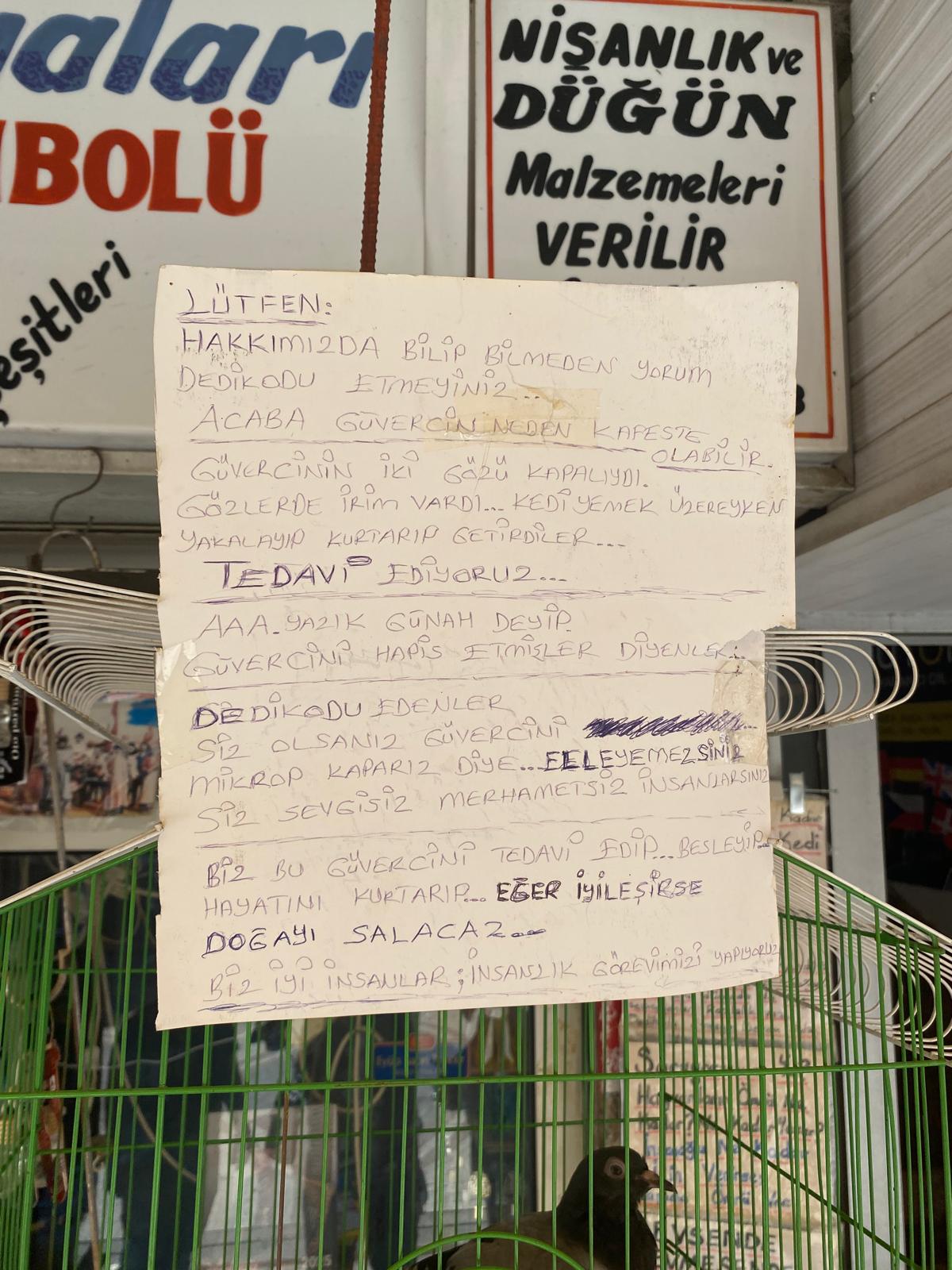 Öte yandan Karakaş, güvercini kafeste gören bazı vatandaşların “Yazık, günah” şeklinde önyargılı şekilde tepki vermesi üzerine, kafesin üzerine güvercinin neden kafeste olduğu hakkında bilgilendirici yazı astı.