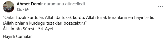 Görevden alınmasının ardından Ahmet Demir, sosyal medya hesabından Cuma dolayısıyla yaptığı paylaşımda şu ifadeleri kullandı: “Onlar tuzak kurdular. Allah da tuzak kurdu. Allah tuzak kuranların en hayırlısıdır. (Allah onların kurduğu tuzakları bozacaktır.) Âl-i İmrân Sûresi - 54. Ayet. Hayırlı Cumalar.”