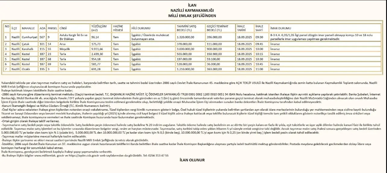 Nazilli Kaymakamlığı Milli Emlak Şefliği, ilçeye bağlı toplam 7 taşınmazı açık teklif yöntemiyle satışa çıkarıyor. İhaleler, 18 Eylül 2025’te Kaymakamlık binasının zemin katında yer alan toplantı salonunda yapılacak.