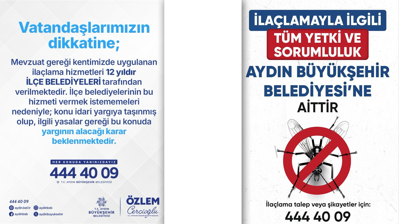 Didim Belediyesinin paylaşımının ardından bu kez de Aydın Büyükşehir Belediyesinin resmi sosyal medya hesabından yapılan paylaşımda ise “Vatandaşlarımızın dikkatine; Mevzuat gereği kentimizde uygulanan ilaçlama hizmetleri 12 yıldır ilçe belediyeleri tarafından verilmektedir. İlçe Belediyelerinin bu hizmeti vermek istememeleri nedeniyle konu idari yargıya taşınmış olup, ilgili yasalar gereği bu konuda yargının alacağı karar beklenmektedir.” duyurusunu paylaştı.