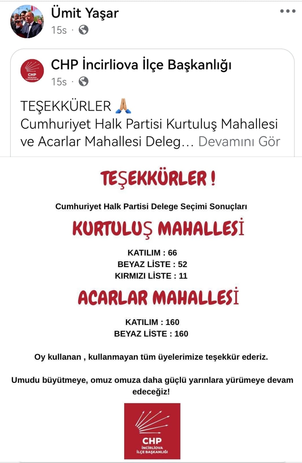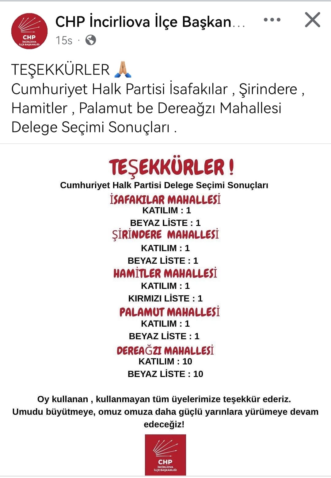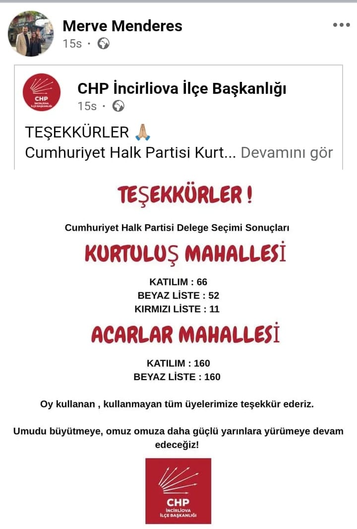 Seçim sonuçlarının sosyal medya üzerinden yanıltıcı bir şekilde paylaşıldığını savunan Türkeri, “Acarlar Mahallemizden çıkan seçim sonuçları, CHP İlçe Başkanlığı, Kadın Kolları Başkanlığı ve beyaz listeyle seçime giren rakip adayın sosyal medya hesaplarından yapılan paylaşımlarda sanki tüm oylar beyaz listeye kullanılmış, kırmızı listeyle girdiğimiz seçimde hiç oy alamamışız gibi bir algı yaratılmıştır. Aynı şekilde 29 Ağustos Cuma günü yapılan, bir üyemiz olan mahallelerde de çıkan sonuç Beyaz Liste şeklinde paylaşılmıştır. Yapılan bu hareketler parti etiğine yakışmayan davranışlardır” dedi.