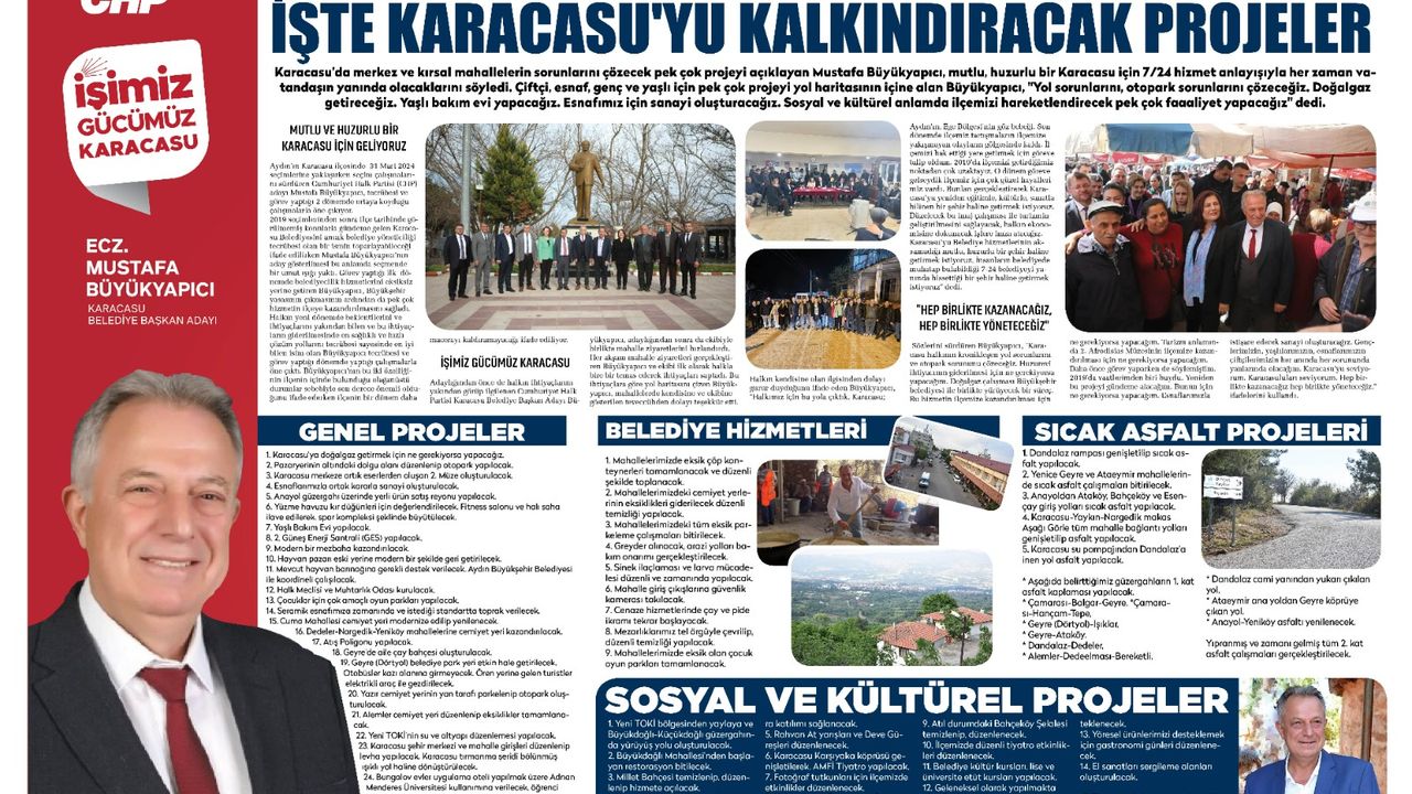 Büyükyapıcı, "Karacasu halkının kronikleşen yol sorunlarını ve otopark sorununu çözeceğiz. Huzurevi ihtiyacının giderilmesi için ne gerekiyorsa yapacağım. Doğalgaz çalışması Büyükşehir belediyesi ile birlikte yürüyecek bir süreç. Bu hizmetin ilçemize kazandırılması için ne gerekiyorsa yapacağım. Turizm anlamında 2. Afrodisias Müzesinin ilçemize kazandırılması için ne gerekiyorsa yapacağım. Daha önce görev yaparken de söylemiştim. 2019'da vaatlerimden biri buydu. Yeniden bu projeyi gündeme alacağım. Bunun için ne gerekiyorsa yapacağım. Esnaflarımızla istişare ederek sanayi oluşturacağız. Gençlerimizin, yaşlılarımızın, esnaflarımızın çiftçilerimizin her anında her sorununda yanlarında olacağım. Karacasu'yu seviyorum. Karacasuluları seviyorum. Hep birlikte kazanacağız hep birlikte yöneteceğiz." ifadelerini kullandı.