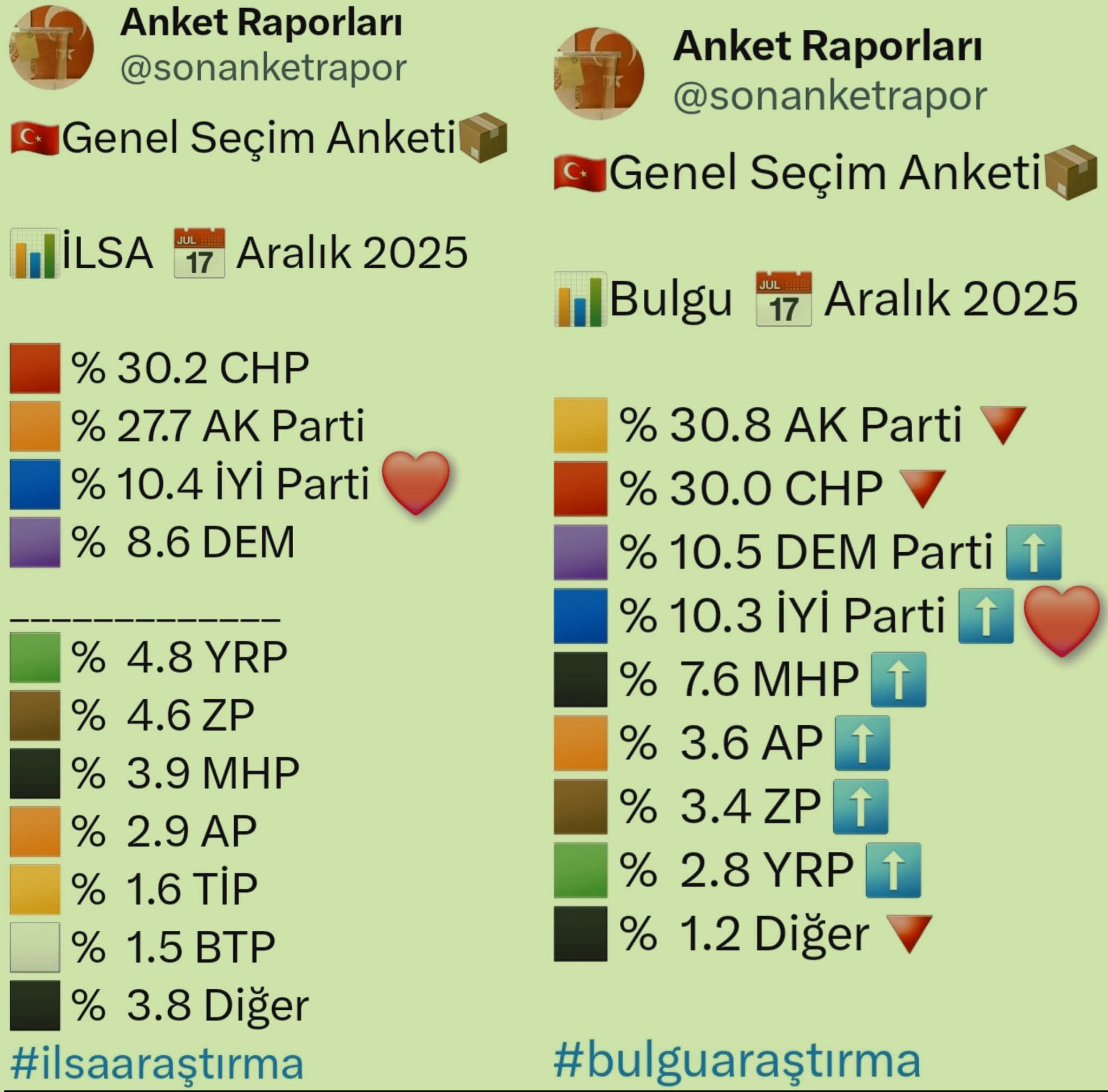 2028 yılında yapılması beklenen genel seçimlere yönelik çalışmalarını sürdüren araştırma şirketleri, siyasi partilerin güncel oy oranlarına ilişkin anketlerini yayımlamaya başladı. İlsa Araştırma Şirketi'nin çalışmasına göre; CHP yüzde 30.2 ile birinci, AK Parti yüzde 27.7 ile ikinci, İYİ Parti yüzde 10.4 ile üçüncü, DEM Parti ise yüzde 8.6 ile dördüncü sırada yer aldı.
