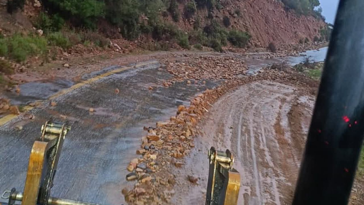 Karacasu ile Alemler Mahallesi arasında ulaşımı sağlayan yola su taşkınları ile birlikte düşen taşlar trafiği kapattı.