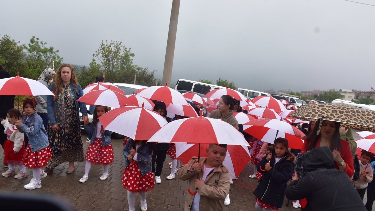 Atatürk Anıtı’na çelenk sunma töreninin hemen ardından, bando eşliğinde çarşı merkezinde yapılması planlanan geleneksel tören geçişi için hazırlanan öğrenciler, yağmura hazırlıksız yakalandı. Ancak yağış, miniklerin ve gençlerin bayram heyecanını gölgeleyemedi.