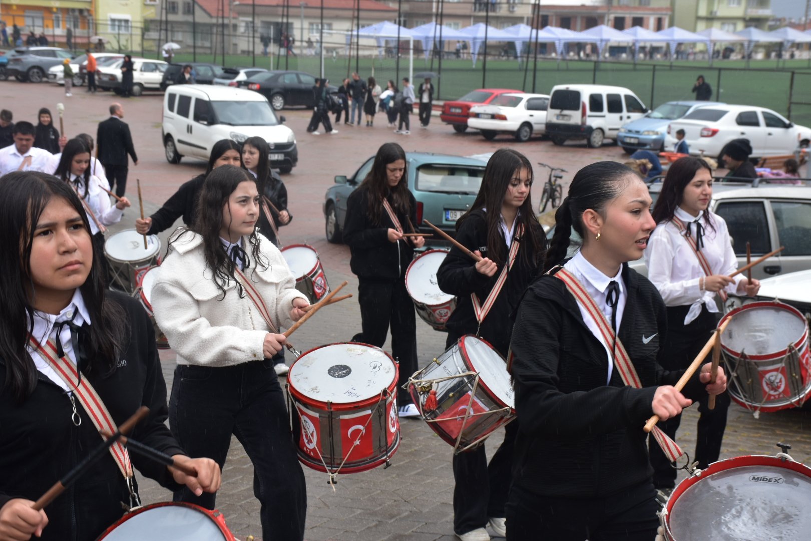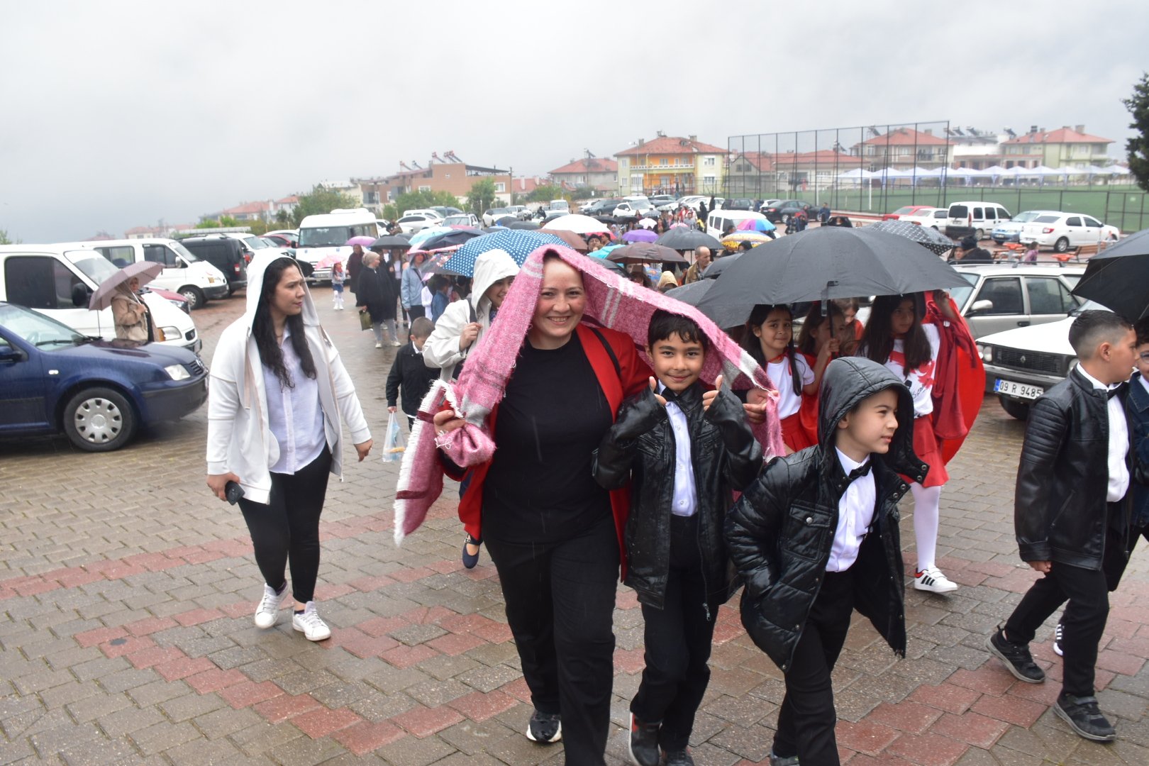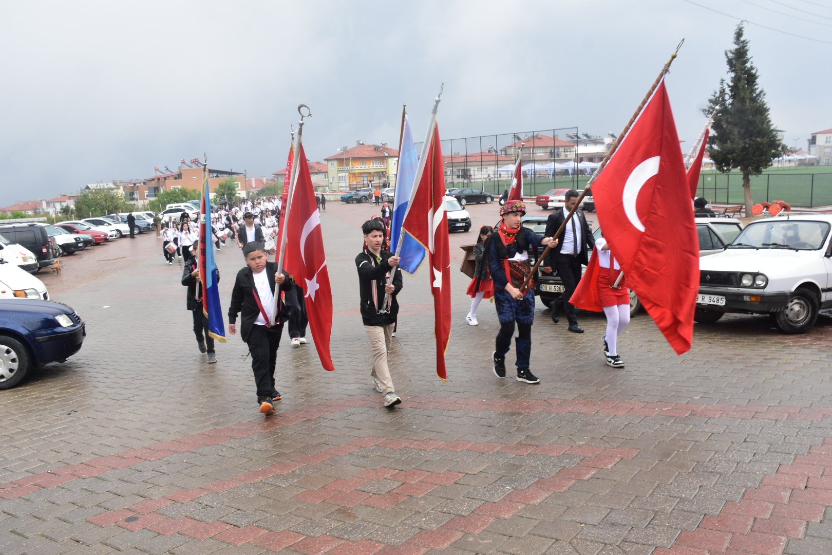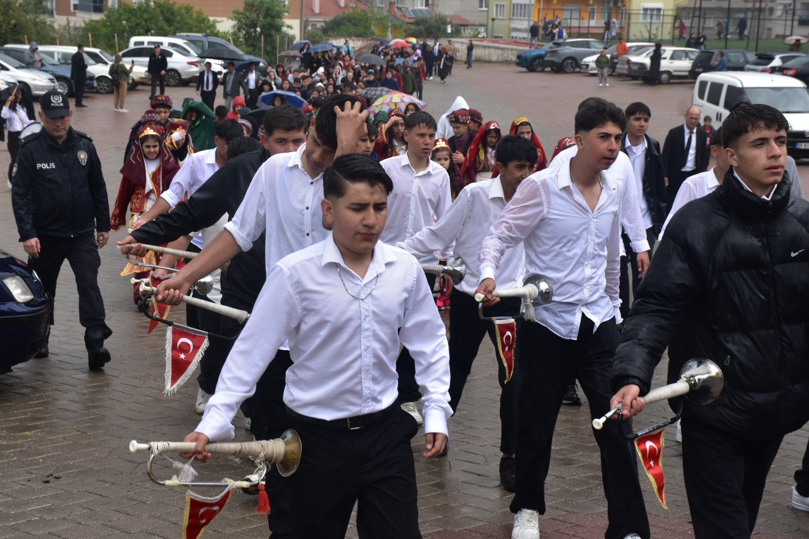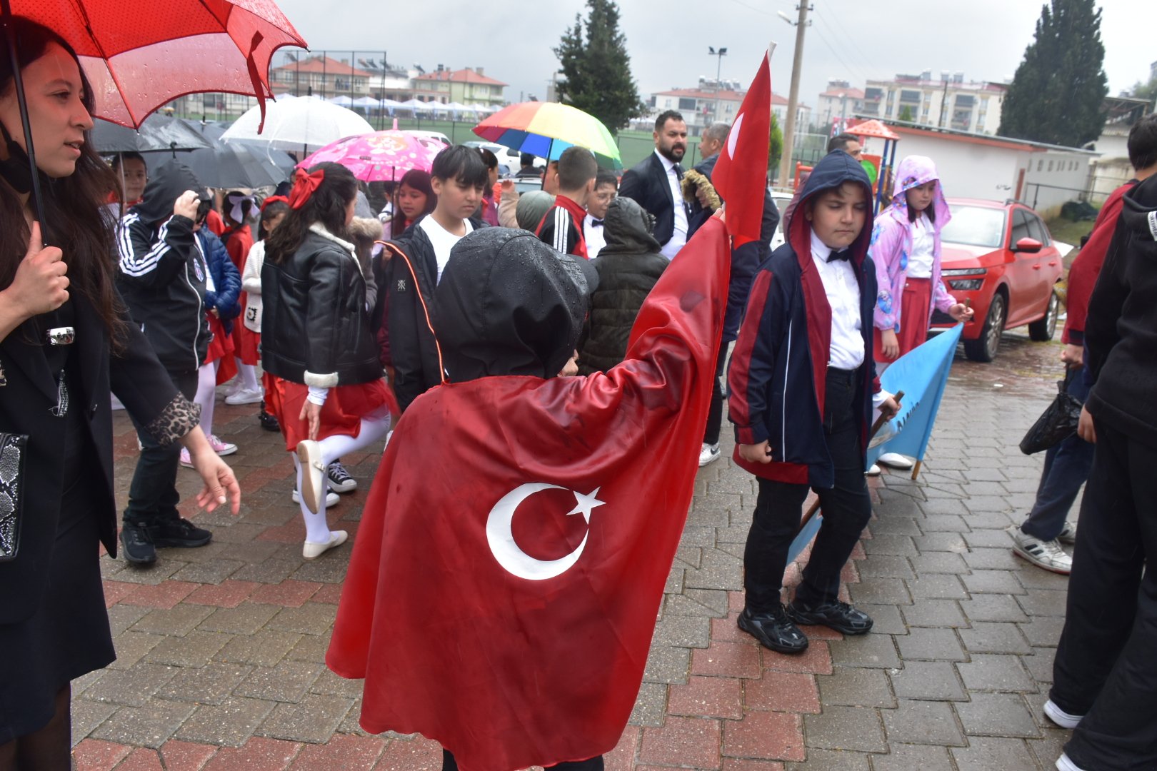 Ellerinde Türk bayrakları, üzerlerinde bayramlık kıyafetleri ve yöresel kostümleriyle yürüyüşe geçen öğrenciler, kapalı spor salonuna ulaşmak için birkaç kilometrelik yolu sağanak altında katetti. Bazı öğrenciler velilerinin şemsiyeleri altına sığınırken, birçoğu bando marşları eşliğinde ıslanarak yürüyüşüne devam etti.