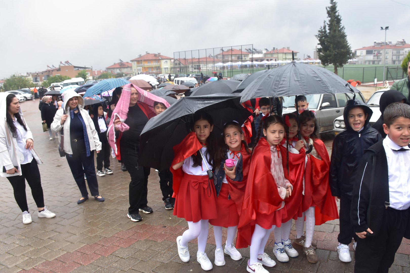 "Yağmura rağmen bayramımızı kutlamaktan vazgeçmedik," diyen miniklerin azmi, çevredeki vatandaşlardan büyük takdir topladı. Bazı okulların öğrencilerin ellerindeki kırmızı beyaz şemsiyeler alana renk kattı. Genç yaşlı törene gelen vatandaşlar renkli görüntüler oluşturdu.