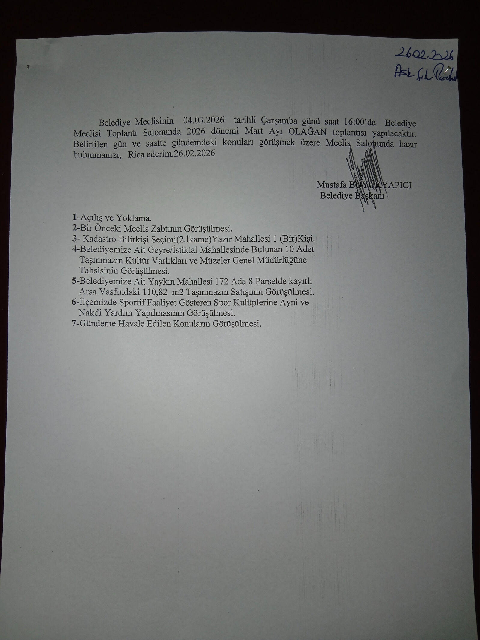 4 Mart Çarşamba günü saat 16.00'da açılış, yoklama ve bir evvelki meclis zaptının görüşülmesi ile başlayacak olan meclis toplantısı Yazır Mahallesine kadostro bilirkişisi seçimi ile devam edecek. Daha sonra Karacasu Belediyesine ait 10 adet taşınmazın Kültür Varlıkları ve Müzeler Genel Müdürlüğüne tahsisi görüşülecek. Belediyeye ait Yaykın Mahallesi 172 ada 8 parselde kayıtlı arsa vasfındaki 110,82 metrekare taşınmazın satışının görüşülmesinden sonra ilçede sportif faaliyetlerde bulunan spor kulüplerine ayni ve nakdi yapılması hususu ele alınacak. Gündeme ilave edilecek olası gündem maddelerinin görüşülmesinden sonra meclis toplantısı sona erecek.