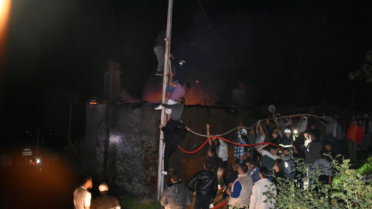 Dar yollar sebebiyle itfaiye araçları eve yaklaşamazken vatandaşlar itfaiye hortumlarını hep birlikte omuzladı.