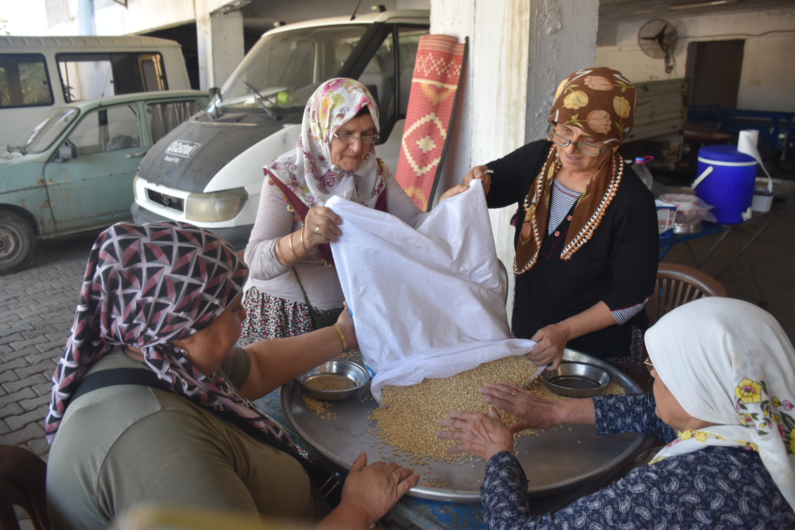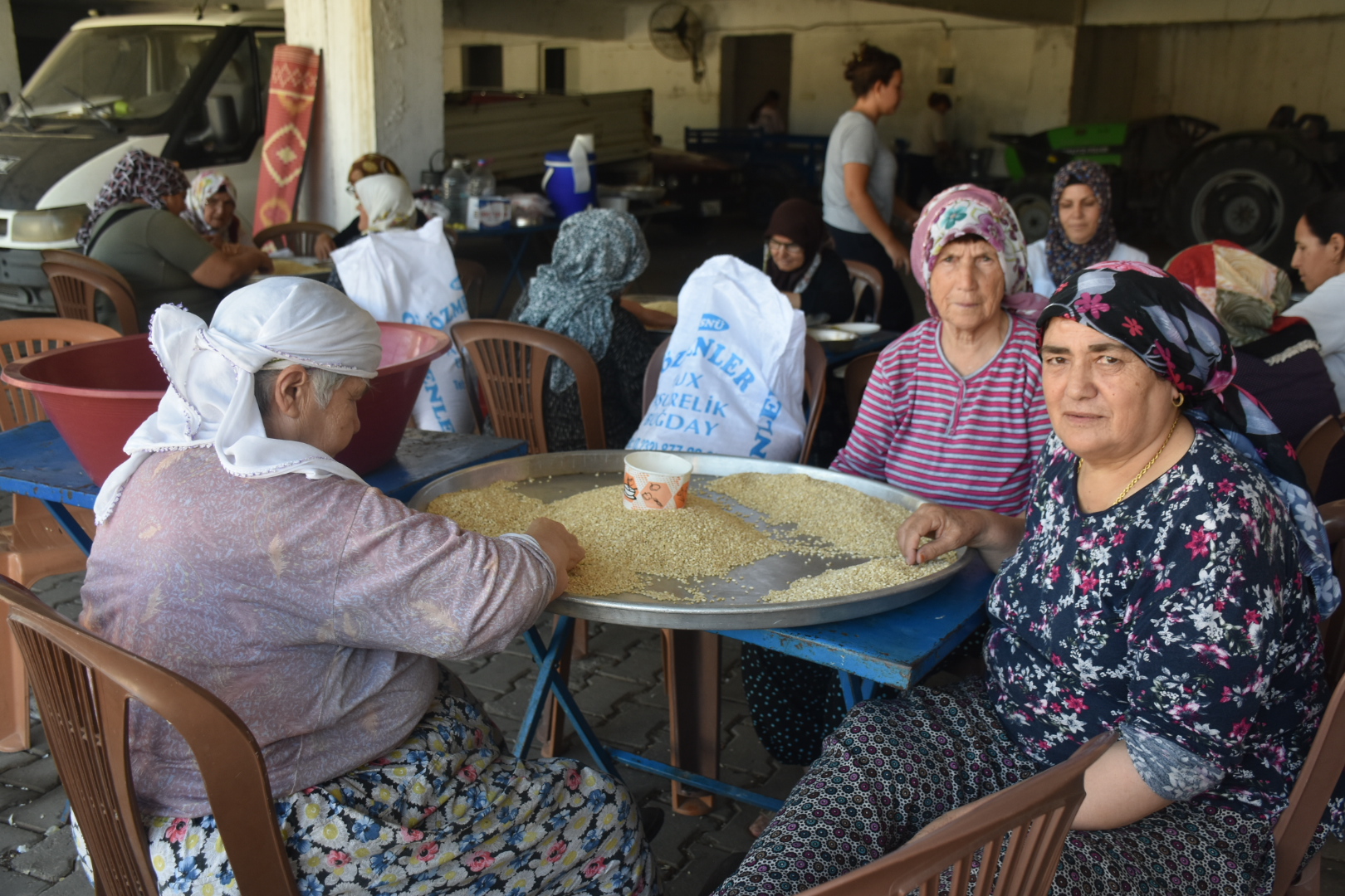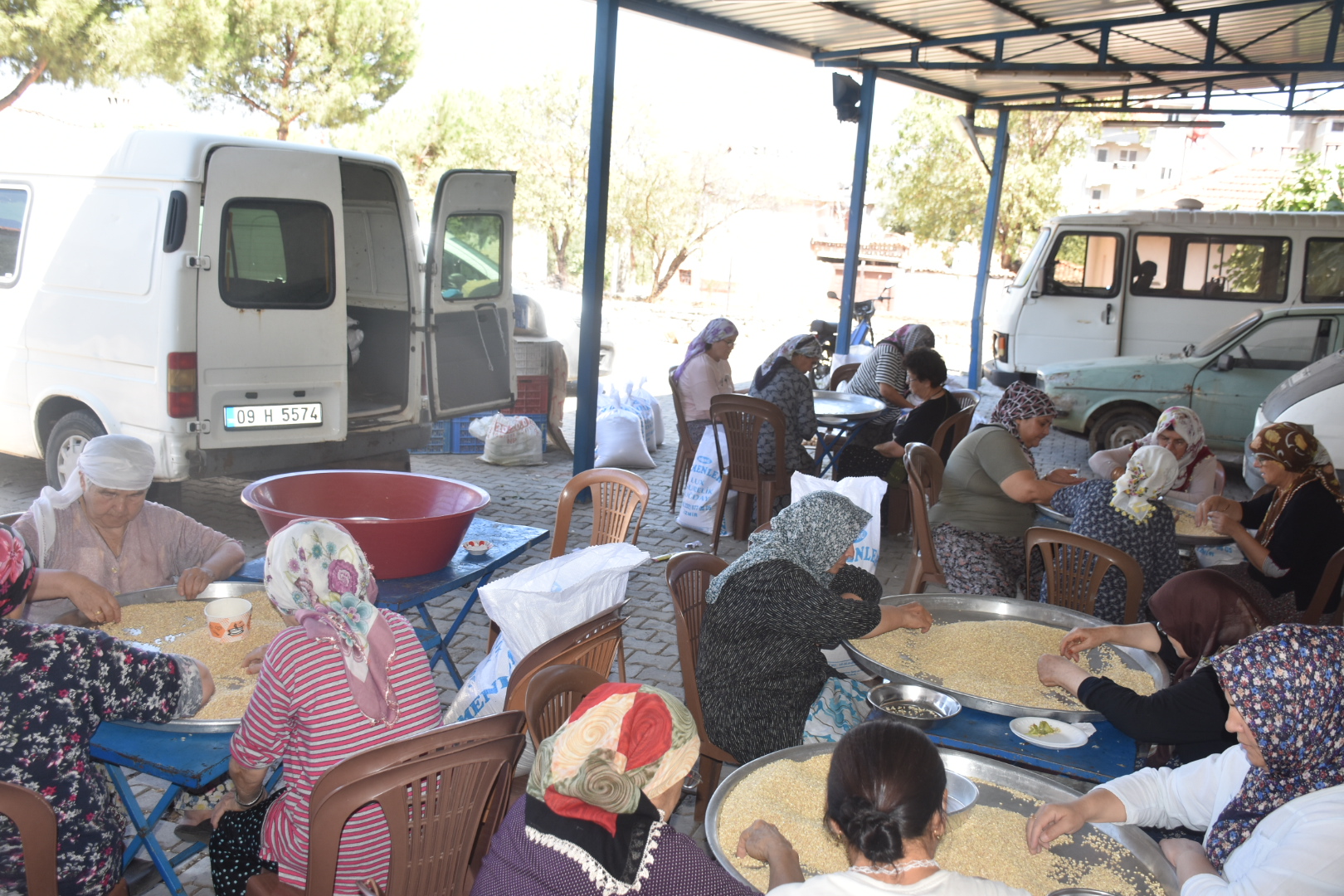 Saadet Bakar, "Taşı ayıklayıp keşkek yapacağız. Misafirlere yedireceğiz. Her zaman hazırlıklar Cuma gününden başlar. Her sene böyle yardım ederiz. Yarın biber doğrayacağız" ifadelerini kullandı.