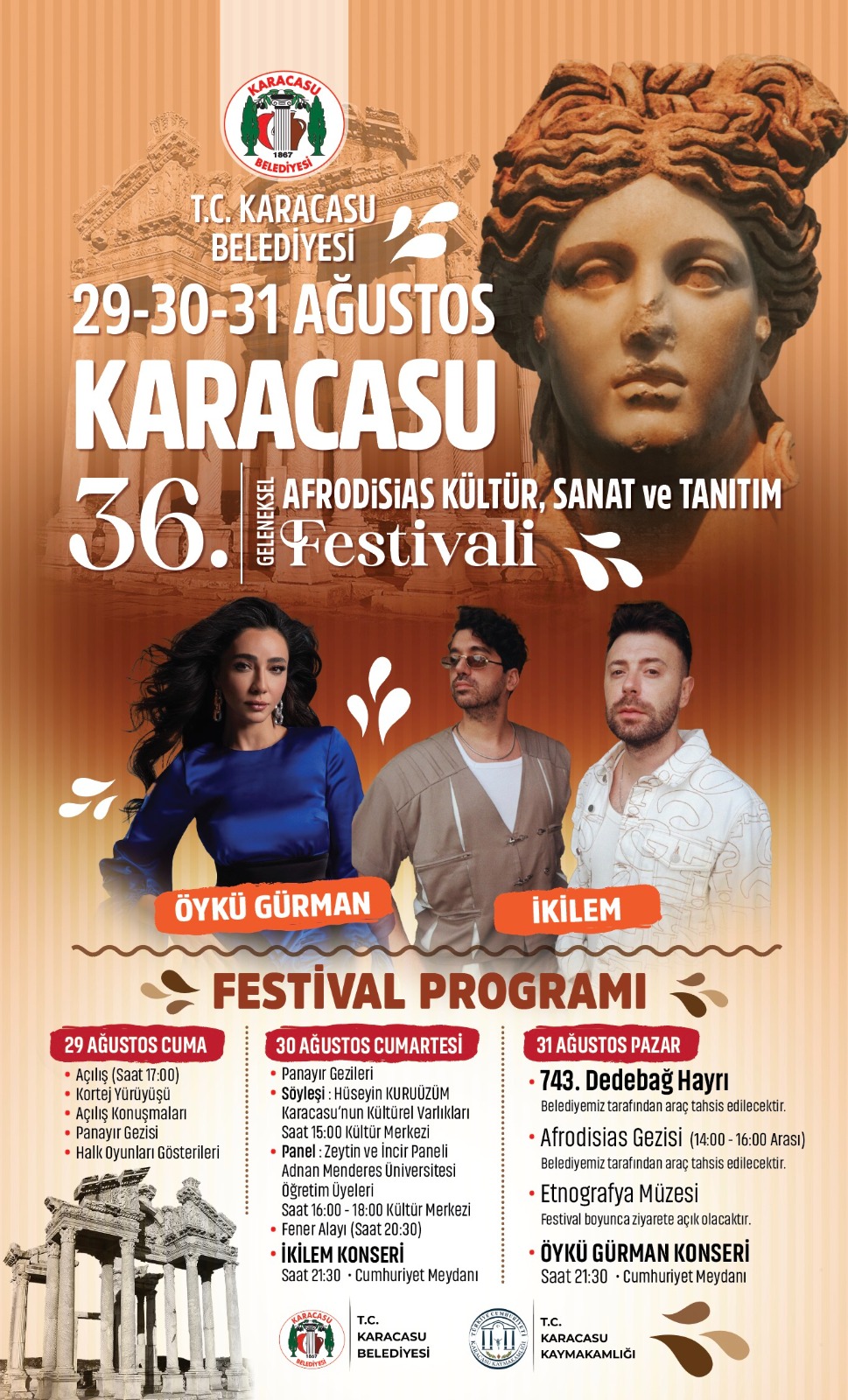 Karacasu Belediyesi tarafından her yıl Ağustos ayının son haftası düzenlenen Afrodisias Kültür Sanat ve Tanıtım Festivali bu yıl da renkli ve coşkulu anlara sahne olacak. 29 Ağustos Cuma günü açılış etkinliği ile başlayacak olan festival coşkusu 30 Ağustos ve 31 Ağustos'ta çeşitli etkinlerle devam edecek. Festivalde Cumartesi günü sahne alacak İkilem ve 31 Ağustos'ta sahne alacak Öykü Gürman katılımcıları coşturacak.