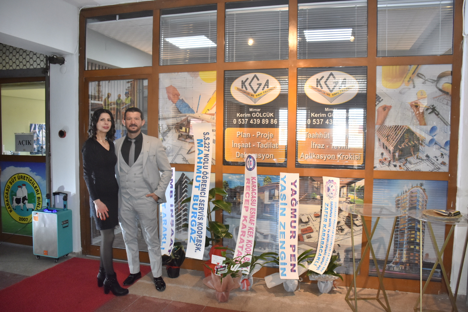 Mimarlık ve iç mimarlık alanlarının yanı sıra plan, proje, inşaat, taahhüt, harita, ifraz, tevhit, aplikasyon krokisi konularında ilçe halkına hizmet verecek olan KGA Mimarlık ve Yapı Tasarım Ofisinin açılışında Eşi Nazmiye Gölcük ile birlikte misafirleri ağırlayan Kerim Gölcük çalışma hayatı ve Karacasu'ya kazandırdığı ofis hakkında bilgiler verdi.