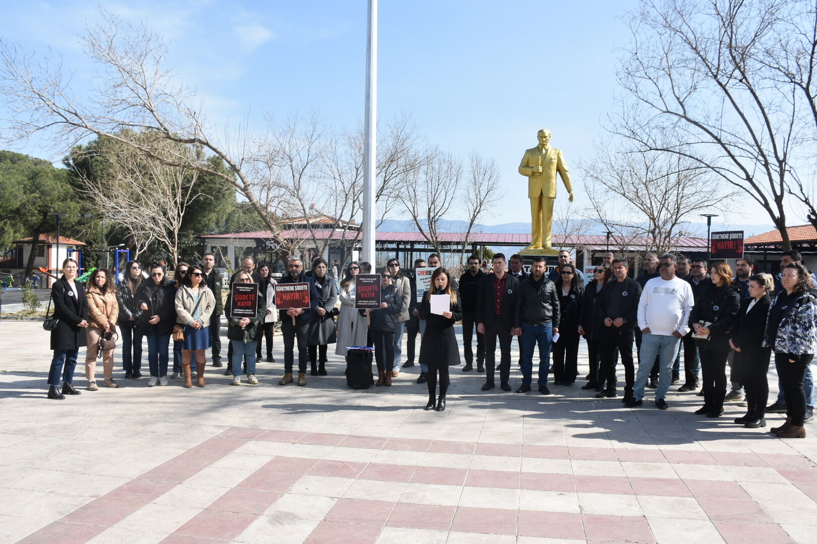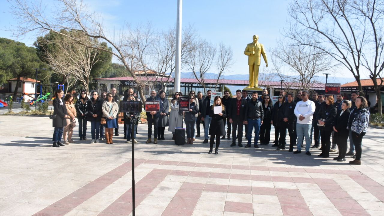Türkiye genelinde olduğu gibi Aydın'ın Karacasu ilçesinde de Eğitim İş Sendikasına bağlı öğretmenler eğitimde yükselen şiddeti protesto etmek için iş bıraktı. Son olarak İstanbul Mesleki ve Teknik Anadolu Lisesi’nde Fatma Nur Çevik isimli öğretmenin bir öğrenci tarafından öldürülmesiyle kendisini gösteren eğitimde şiddet olaylarıyla ilgili basın açıklaması yapan öğretmenler Milli Eğitim Bakanı Yusuf Tekin'e seslendi. Öğretmenler Bakan Tekin'e, "Daha kaç öğretmenimizin can vermesi gerekiyor? Okullardaki güvenlik açığının bedelini canımızla mı ödeyeceğiz? Öğretmenler her gün ölüm korkusuyla mı derse girecek?” sorularını yöneltti. Öğretmenler ellerinde, "Öğretmene şiddete hayır, öğretmenleri koruyun, grevdeyiz, hedef gösterildik, öldürüldük, yastayız, öfkeliyiz" yazılı dövizler taşıdı.
