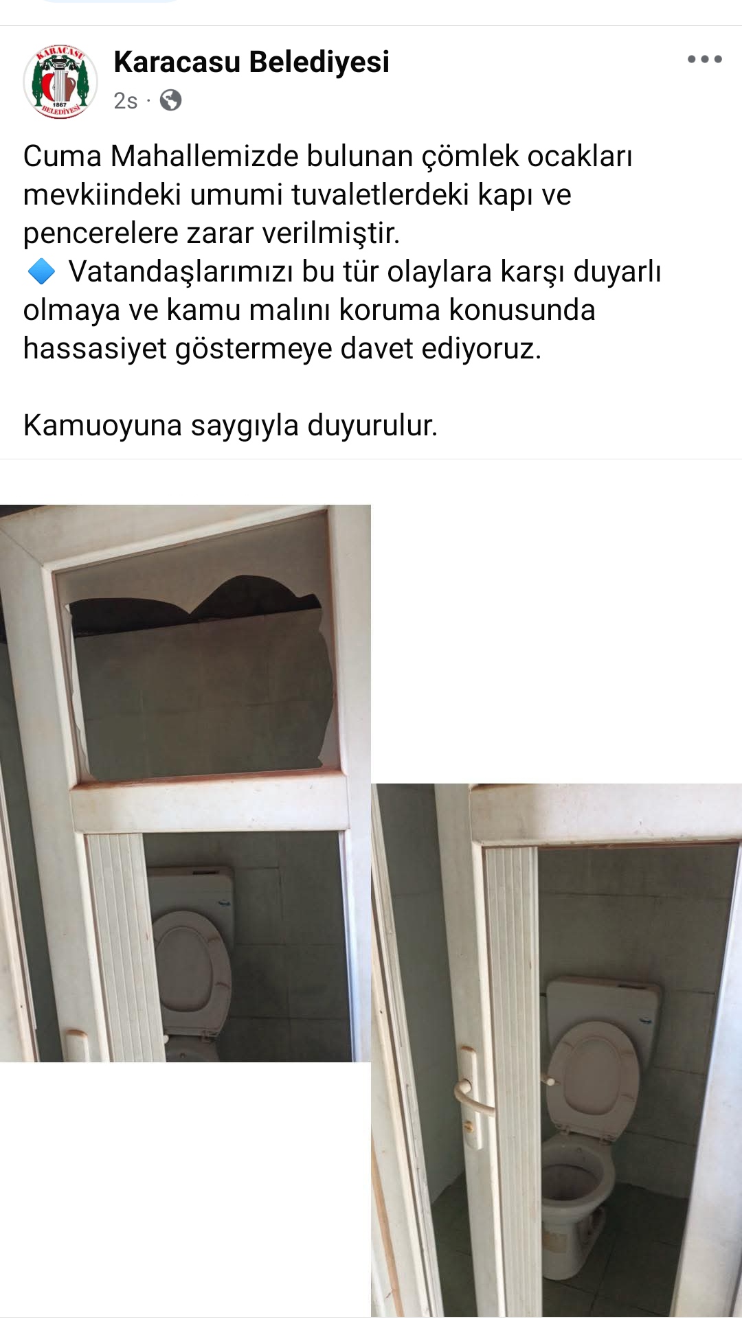 "Cuma Mahallemizde bulunan çömlek ocakları mevkiindeki umumi tuvaletlerdeki kapı ve pencerelere zarar verilmiştir. Vatandaşlarımızı bu tür olaylara karşı duyarlı olmaya ve kamu malını koruma konusunda hassasiyet göstermeye davet ediyoruz. Kamuoyuna saygıyla duyurulur" ifadeleri yer aldı.