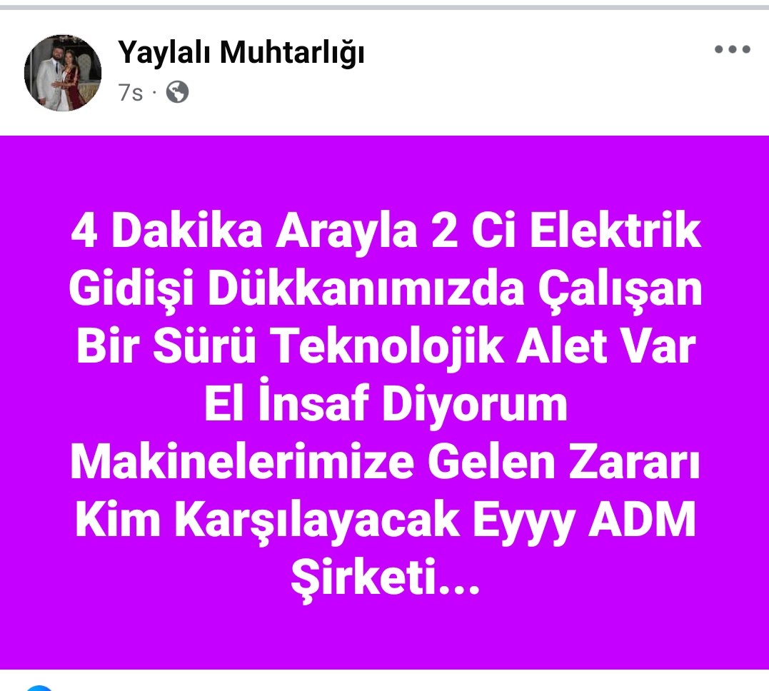 Vatandaşların isyanına Yaylalı Mahallesi Muhtarı Coşkun Uzkuç da sosyal medyadan katıldı. Uzkuç yaptığı paylaşımda, "4 Dakika arayla ikinci elektrik gidişi. Dükkanımızda çalışan bir sürü teknolojik alet var. El insaf diyorum. Makinalarımıza gelen zararı kim karşılayacak. Eyy! Aydem şirketi" ifadelerini kullandı.
