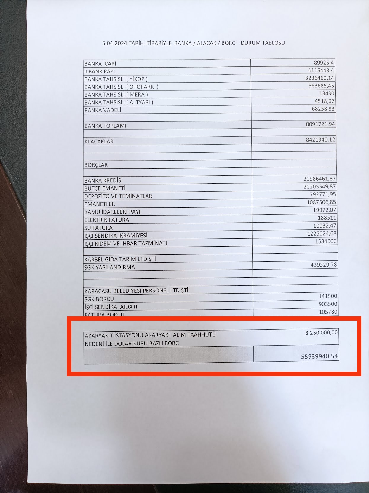 Belediye Başkanı Mustafa Büyükyapıcı, görevi devraladığı borçlarla ilgili önüne konulan evrağı kamuoyu ile paylaşmış, "Akaryakıt istasyonu ile de komik bir rakam var. Taahhüt edilen miktarda akaryakıt alınmadığında her ay bu ceza geliyormuş. Bu rakam belediyeyi batırır. Şu an anladığım 100 ton akaryakıt satacağım diyor. 60 ton satabiliyor. Aradaki 40 ton dolar bazında buraya yansıyor" ifadelerini kullanmıştı.