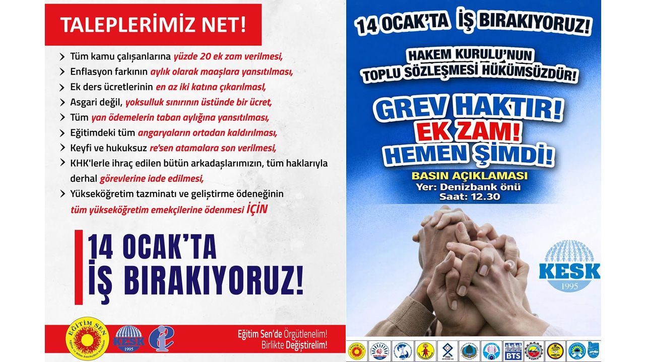 KESK Eş Genel Başkanı Ahmet Karagöz, sosyal medya üzerinden yaptığı açıklamada, eylem kapsamında bilgi vererek, ''Yoksulluğa, güvencesizliğe ve adaletsizliğe karşı; ekonomik, özlük, demokratik, siyasal ve sosyal haklarımız için üretimden gelen gücümüzü kullanıyoruz. 14 Ocak’ta iş bırakıyoruz. Kurtuluş yok tek başına; ya hep beraber ya hiçbirimiz.''sözlerine yer verdi.