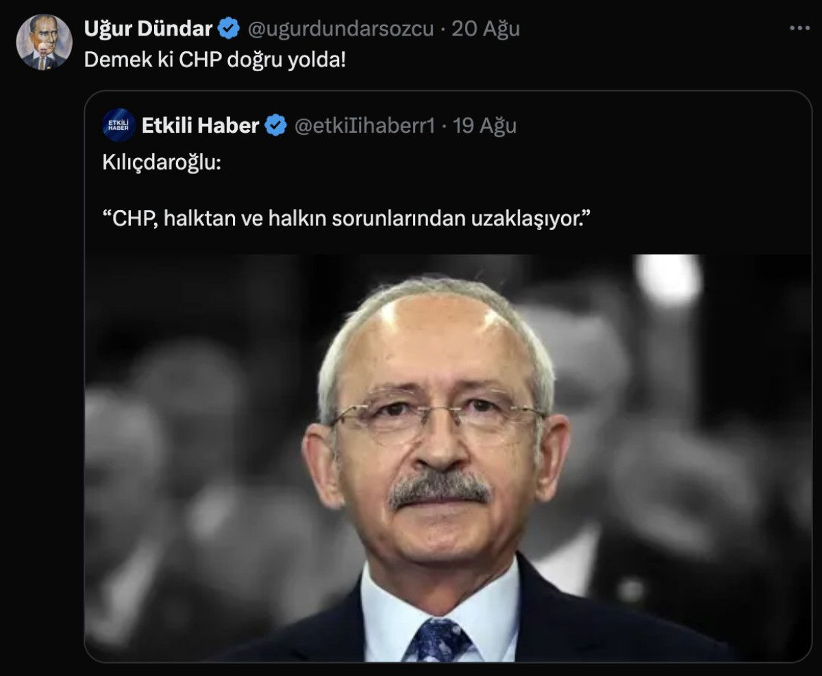 Dündar, bir internet haber sitesinin "Kılıçdaroğlu: "CHP, halktan ve halkın sorunlarından uzaklaşıyor." ifadeleri ile paylaşımını alıntılamış ve ardından şu sözler ile "Demek ki CHP doğru yolda" paylaşmıştı.