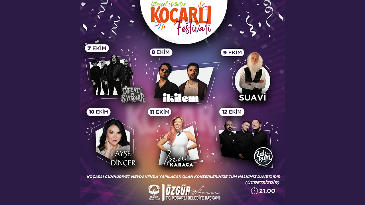 Koçarlı 15. Geleneksel Çam Fıstığı ve Yöresel Ürünler Festivali, 7 Ekim’de yapılacak dev kortej yürüyüşüyle başlayacak. Ardından her akşam, sevilen sanatçıların sahne alacağı konserlerle vatandaşlar müzik ve eğlenceye doyacak. Vatandaşların sosyalleşip müziğe doyacağı festival kapsamında; 8 Ekim’de *İkilem, 9 Ekim’de Suavi, 10 Ekim’de Ayşe Dinçer, 11 Ekim’de Işın Karaca, 12 Ekim’de ise Zakkum konser verecek.