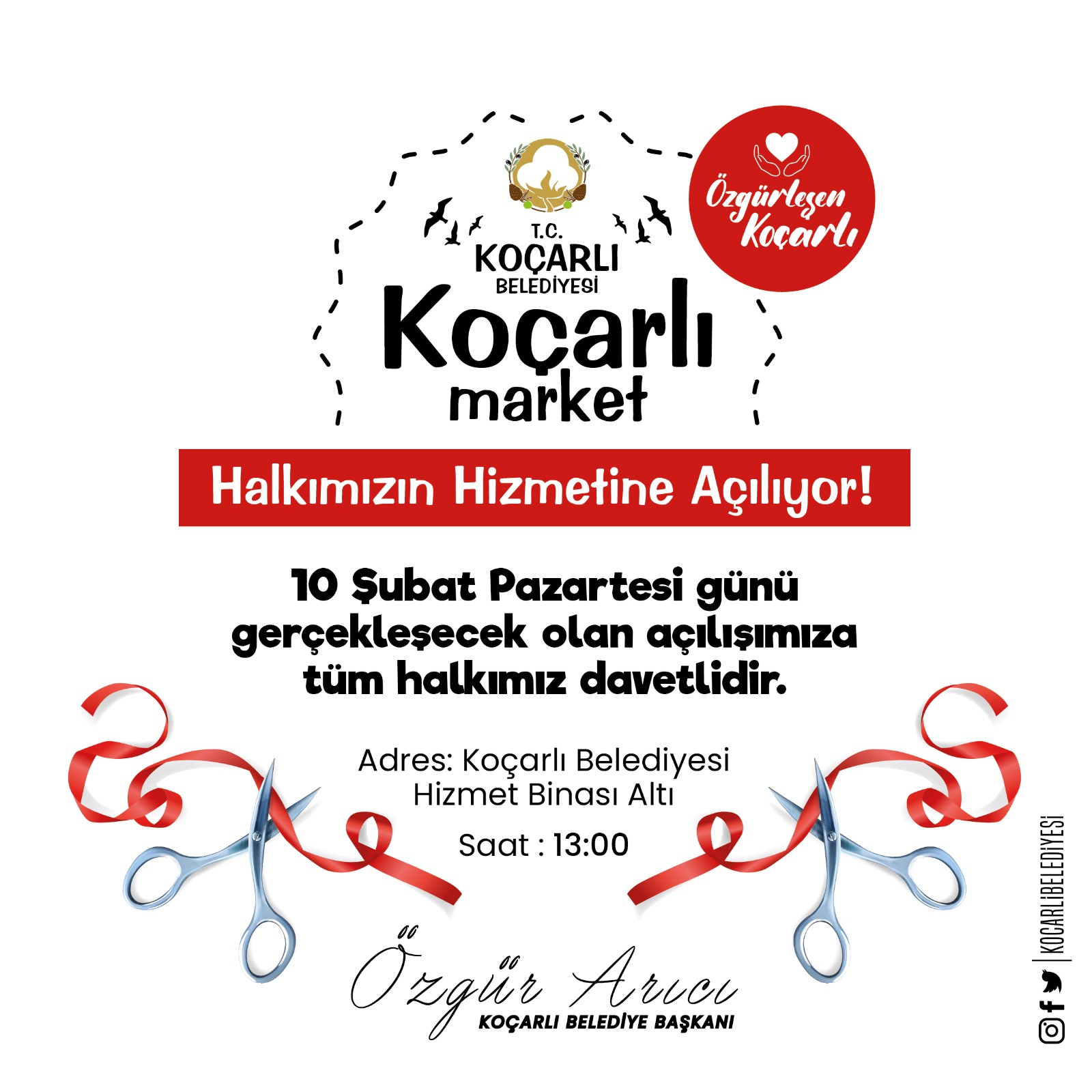 Koçarlı Market, modern tasarımı ve ferah alışveriş ortamıyla da dikkat çekecek diyen Koçarlı Belediye Başkanı Özgür Arıcı, "Belediye güvencesiyle satışa sunulacak ürünlerimiz ile fiyat açısından vatandaşların bütçesini korumayı hedefliyoruz. Market, sadece günlük ihtiyaçları karşılamakla kalmayıp ilçemizin ve ilimizin yöresel ürünlerinin bulunacağı bir yer olacak" dedi.