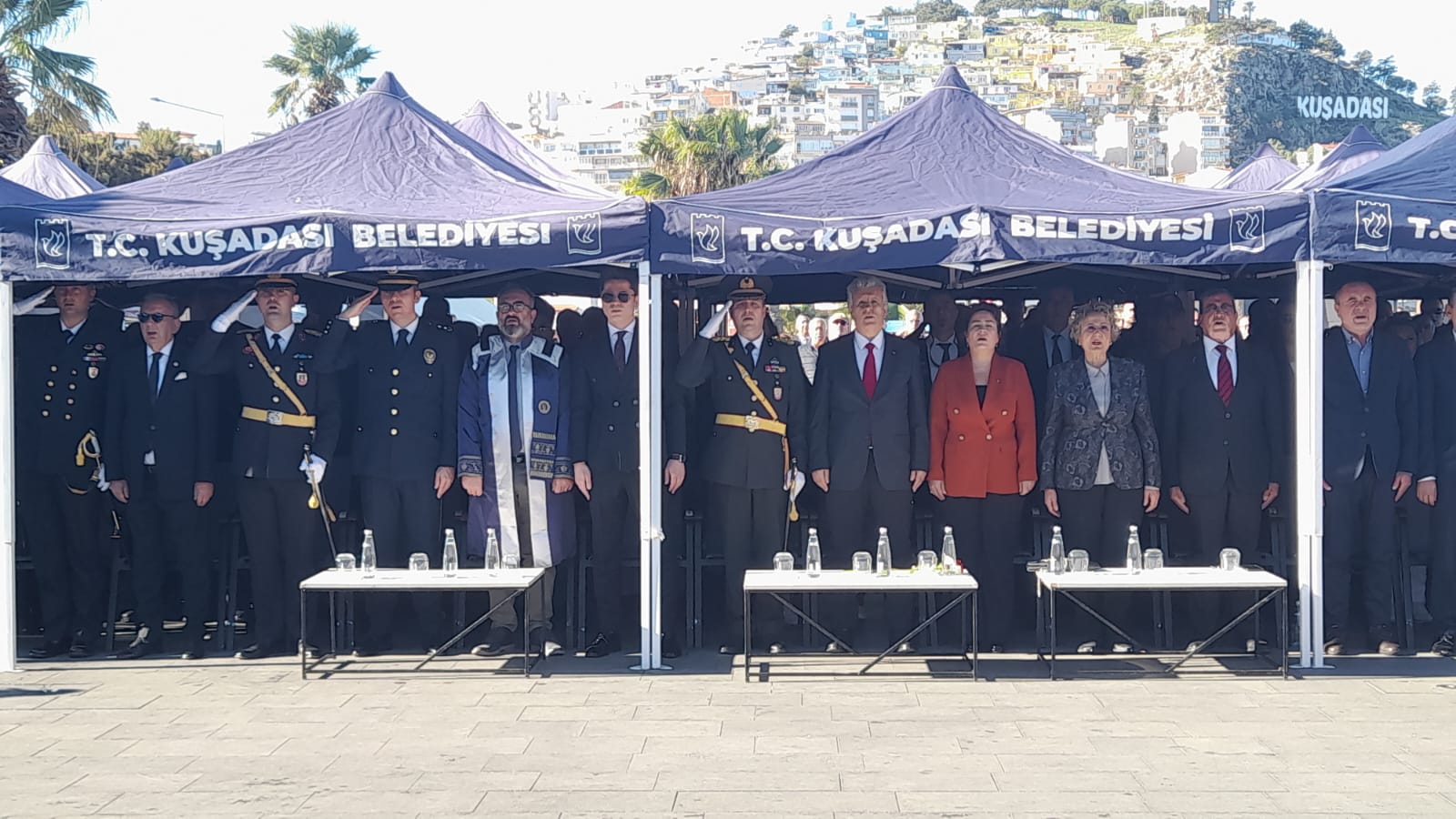 Saat 10.00'da Atatürk Anıtı’nda devam eden resmi törene Kuşadası İlçe Kayamakamı İbrahim Keklik, Garnizon Komutanı Personel Yarbay İlker Görkem, Belediye Başkanı Yardımcısı Ayşegül Dağlı, siyasi parti temsilcileri, mülki ve idari amirler, kentte eğitim veren okulların öğrencileri ve vatandaşlar yoğun katılım gösterdi. Saygı duruşunda bulunulması ve İstiklal Marşı'nın okunmasıyla başlayan tören Kaymakam Keklik'in günün anlam ve önemini belirten konuşmasıyla devam etti.