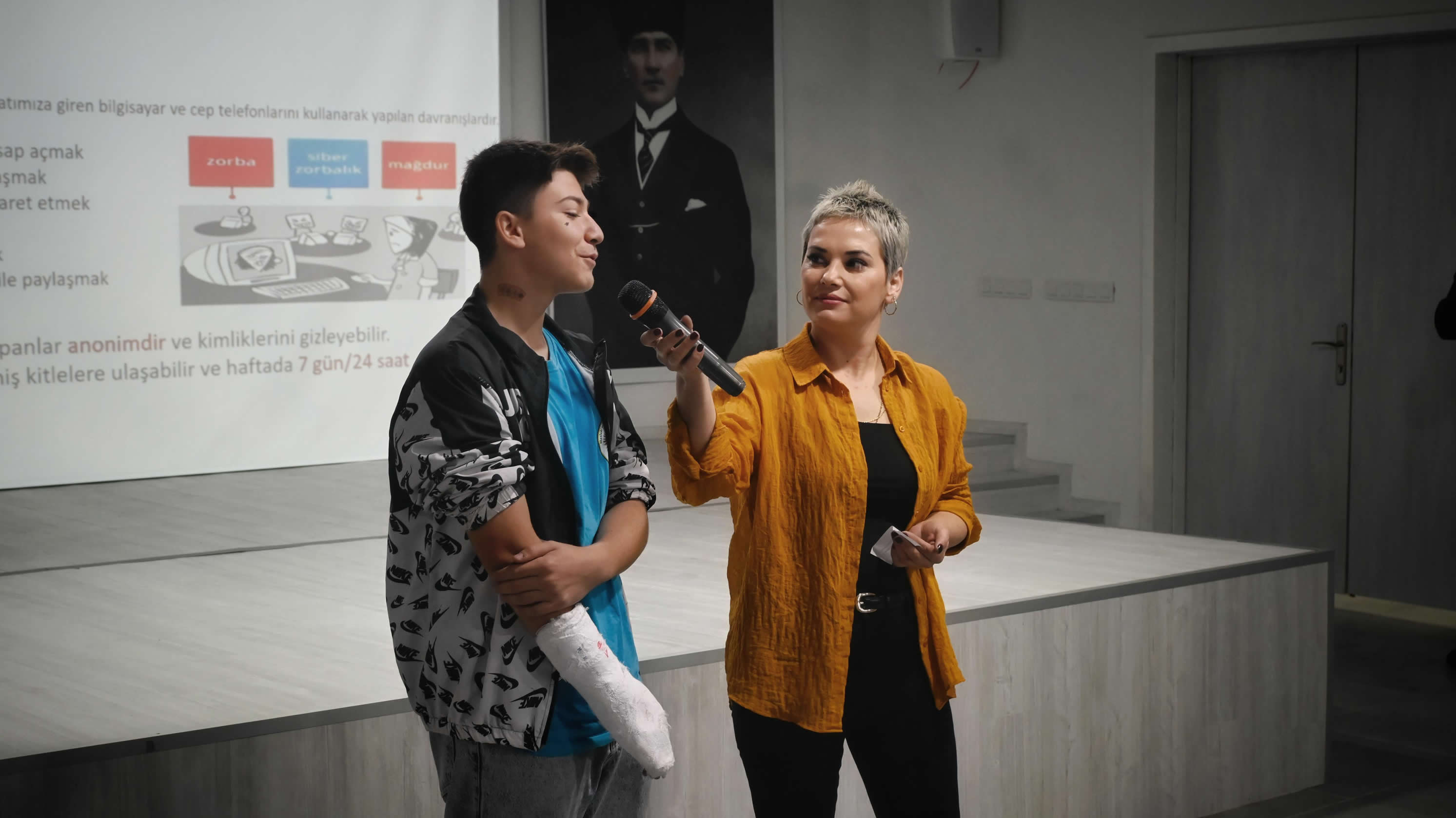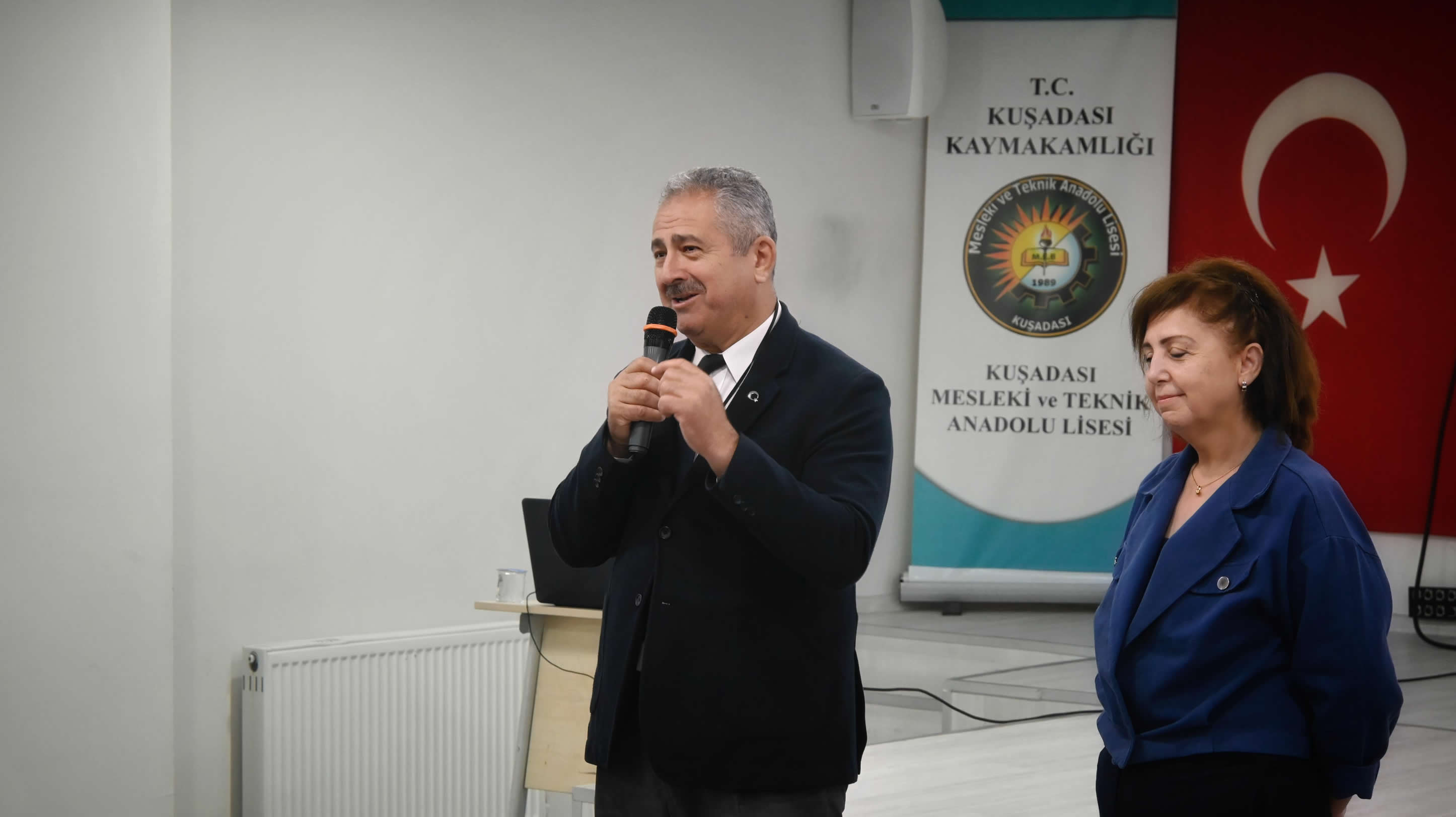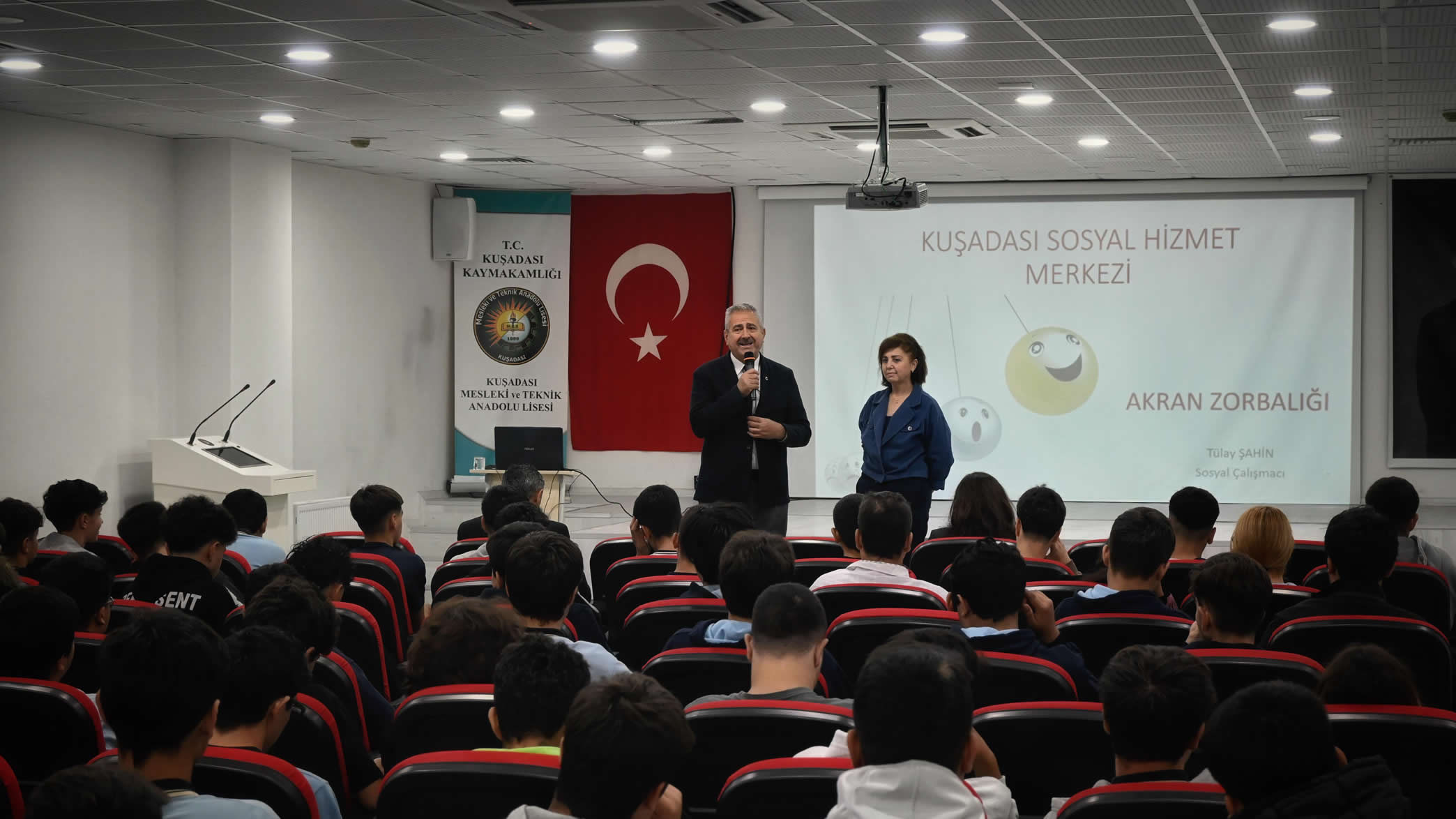 Kuşadası İlçe Milli Eğitim Müdürlüğü'nün, Kuşadası Mesleki ve Teknik Anadolu Lisesi'nde öğrencilere yönelik düzenlediği 'Akran zorbalığı' temalı seminere ilçe Milli Eğitim Müdürü İbrahim Ataman, İlhan Milli Eğitim Şube Müdürü Hanifi Çelik, Sosyal Hizmetler Kuşadası Şube Müdüresi Neziha Büyük Solak, Sosyal Hizmetler Uzmanı Tülay Şahin, öğretmen ve öğrenciler katılım gösterdi.