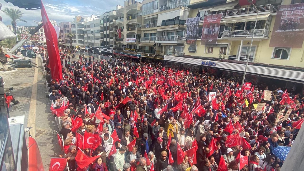 Kuşadası’nda, CHP mitingi ilçede dikkat çeken bir kalabalık oluştu. Tutuklanarak görevden uzaklaştırılan Kuşadası Belediye Başkanı Ömer Günel için düzenlenen miting öncesinde İsmail Cem Meydanı’nda yoğun kalabalık CHP Lideri Özgür Özel’i bekliyor.