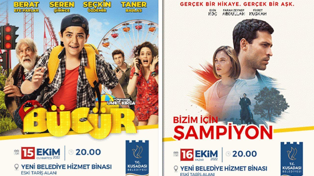 Kuşadası Belediyesi ve Aydın Büyükşehir Belediyesi’nin yeni hizmet binası önünde çocuklar için 15 Ekim Cumartesi günü saat 20.00’da “Bücür” filmi, 16 Ekim Pazar günü saat 20.00’da yetişkinler için “Bizim İçin Şampiyon” filmi gösterilecek. Cafer Kotan Parkı’nda ise 22 Ekim Cumartesi Günü saat 20.00’de çocuklar için “Bizim Köyün Şarkısı”filmi, 23 Ekim Pazar günü saat 20.00’de yetişkinler için “Naim” filmi gösterilecek.