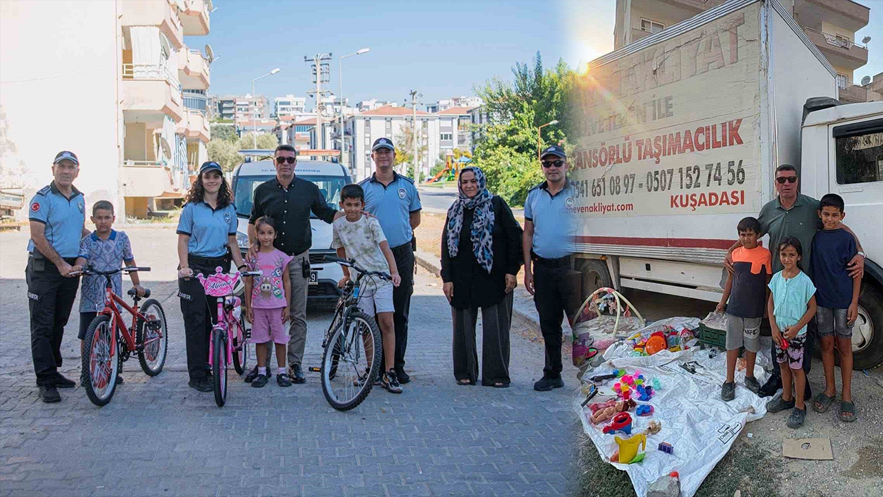 Edinilen bilgiye göre; Aydın’ın Kuşadası ilçesinde yaşayan ancak bisikletleri olmadığı öğrenilen Kuzey, Derviş ve KUmasl adlı 3 çocuğu her gün farklı sokaklarda kaldırımda tezgah açıp oyuncaklarını satarken gören Kuşadası Belediyesi Zabıta Müdürülüğü ekipleri, çocuklarla görüşüp ’neden her gün sokak sokak dolaşıp tezgah açarak oyuncak satmaya çalıştıklarını’ sordu. Çocukların, bisiklet almak için para biriktirmeleri gerektiğini bunun için de oyuncaklarını satışa çıkardıklarını öğrenen zabıta ekipleri sosyal sorumluluk anlayışı ile 3 adet bisiklet temin edip çocuklara hediye etti.