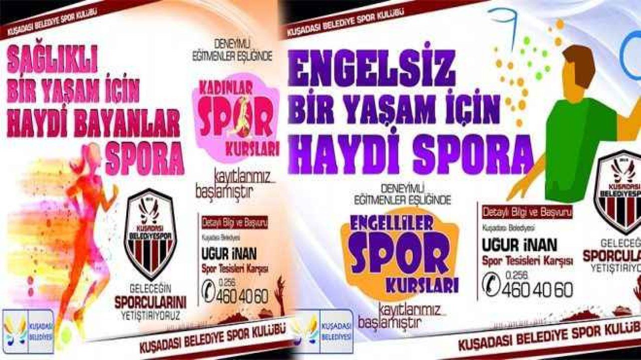 Farklı yaş gruplarından bedensel engellilere yönelik olarak düzenlenen spor kursları ile engelli bireylerin psikomotor ve bedensel gelişimlerine katkıda bulunulması ve sosyalleşmelerinin sağlanması hedefleniyor. Engellilere yönelik spor kurslarının yanı sıra Kuşadası Belediyespor bünyesinde "Sağlıklı Bir Yaşam İçin Haydi Bayanlar Spora" sloganıyla kadınlar için de spor kursları başlıyor. Sporu kadınların yaşamlarının bir parçası haline getirme hedefi ile düzenlenen kurslar, Kuşadası Belediyesi Uğur İnan Kapalı Spor Salonunda Çarşamba ve Cuma günleri saat 14.00'da uzman eğitmenler tarafından verilecek. Engelliler ve kadınların spor kursları için kayıtlar, Kuşadası Belediyesi Uğur İnan Kapalı Spor Salonunun karşısında bulunan Kuşadası Belediyespor binasında sürüyor.