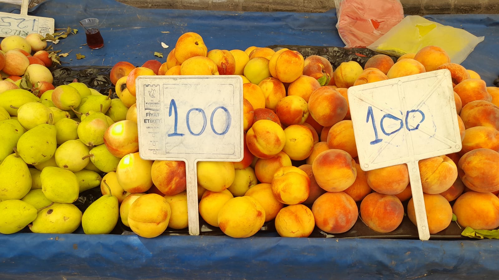 Kuşadası'nda her Perşembe günü kurulan üretici pazarında, her ne kadar ürünler doğrudan üreticiden tezgahlara gelse de özellikle meyve fiyatlarının yüksekliği vatandaşın bütçesini bu hafta zorladı. Vatandaş özellikle bölgeye özgü kiraz, şeftali, incir gibi ürünlerin fiyat yüksekliğinden şikayet ederken pazar esnafı pahalılığı kışın yaşanan olumsuz hava koşullarına, üretim yetersizliğine ve artan maliyetlere bağladı. Yerel Üretici Pazarı'nda bu hafta şeftali 100-120 lira, erik, elma, armut 100 lira, üzüm 80-100 lira, taze incir 150 ve kuru incir 600 lira kilo fiyatları ile tezgahlarda sergilendi. Meyve fiyatlarına kıyasla düşüş gözlemlenen sebze tezgahlarında biber çeşitleri 35-40, domates 20-35, kapya biber 35-40, patlıcan 20-25, limon 150, fasulye, bamya, barbun, börülce 100-120 lira kilo fiyatlarıyla alıcısını bekledi.