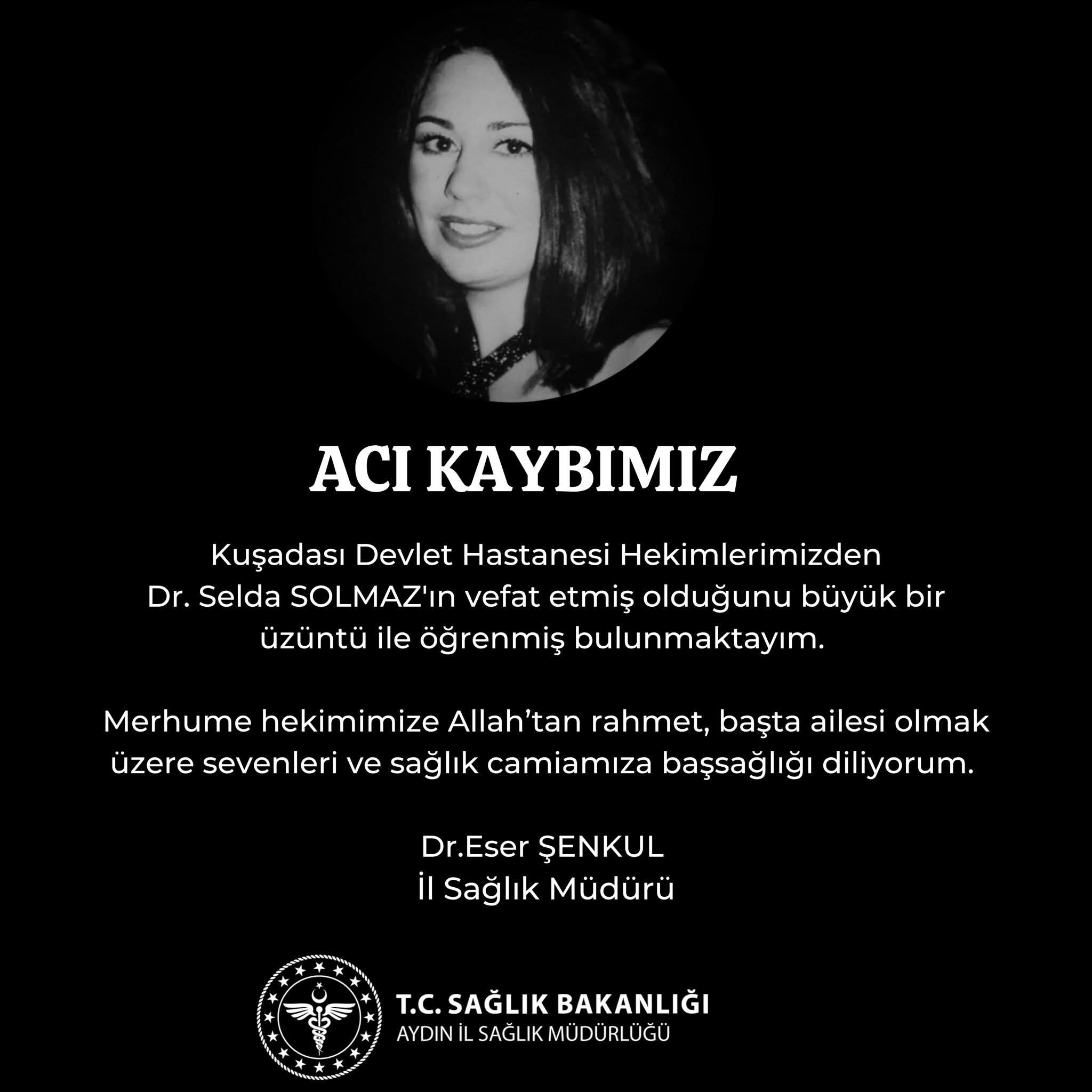 Dr. Selda Solmaz'ın vefatnın ardından sosyal medya hesapları üzerinden açıklamada bulunan Kuşadası Devlet Hastanesi başhekimliği ve Aydın İl Sağlık Müdürü Dr. Eser Şenkul ve Sağlık-Sen Aydın Şubesi Dr. Selda Solmaz'ın vefatını büyük bir üzüntü ile öğrendiklerini belirterek, ''Kuşadası Devlet Hastanesi hekimlerimizden Dr. Selda Solmaz’ın vefat ettiğini büyük bir üzüntüyle öğrenmiş bulunmaktayız. Merhume hekimimize Allah’tan rahmet, başta ailesi olmak üzere sevenleri ve sağlık camiamıza başsağlığı diliyorum” ifadelerine yer verdi.