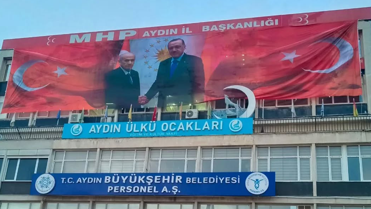 MHP Aydın İl Başkanlığı, Cumhur İttifakı’nın Aydın’daki uyumunu güçlü bir görselle kamuoyuna yansıttı. Cumhurbaşkanı Recep Tayyip Erdoğan’ın kente yapacağı ziyaret öncesinde parti binasına asılan dev pankart, kent merkezinde büyük ilgi gördü.