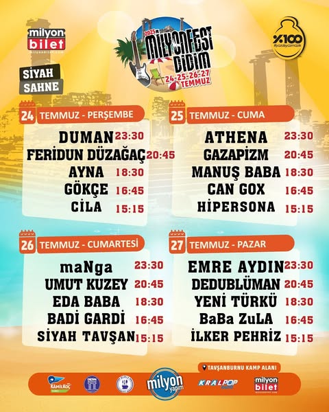 Didim Belediyesinin katkılarıyla düzenlenecek olan ve Türkiye'nin en büyük açık hava müzik festivallerinden biri olan “Milyonfest Didim” farklı sponsorların destekleriyle 24 Temmuz Çarşamba günü başlıyor. Tavşanburnu Orman Kampı’nda gerçekleştirilecek olan festival, dört gün sürecek.