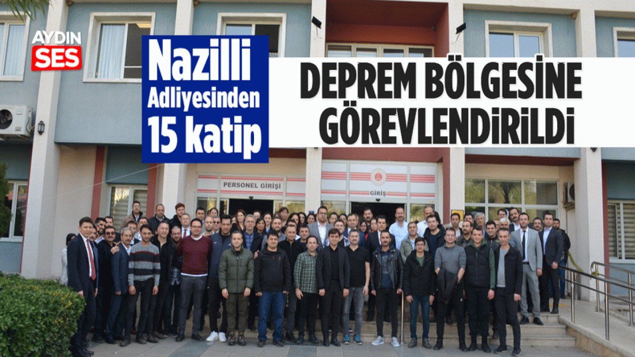 Bu çalışmalarda görev almak için Adalet Bakanlığı tarafından Nazilli Adliyesi’nden de 15 zabit katibi, Kahramanmaraş merkez ve Pazarcık ilçelerine görevlendirildi. Görevlendirilen katipler Nazilli Adliyesi önünden saat 14:00’te uğurlandı. Uğurlamaya Nazilli Cumhuriyet Başsavcısı Murat Dilsiz, Ağır Ceza Mahkemesi ve Adalet Komisyonu Başkanı Menduh Yalvaç, hakimler, savcılar ve adliye çalışanları katıldı.GÖREV SÜRESİ 9 GÜN