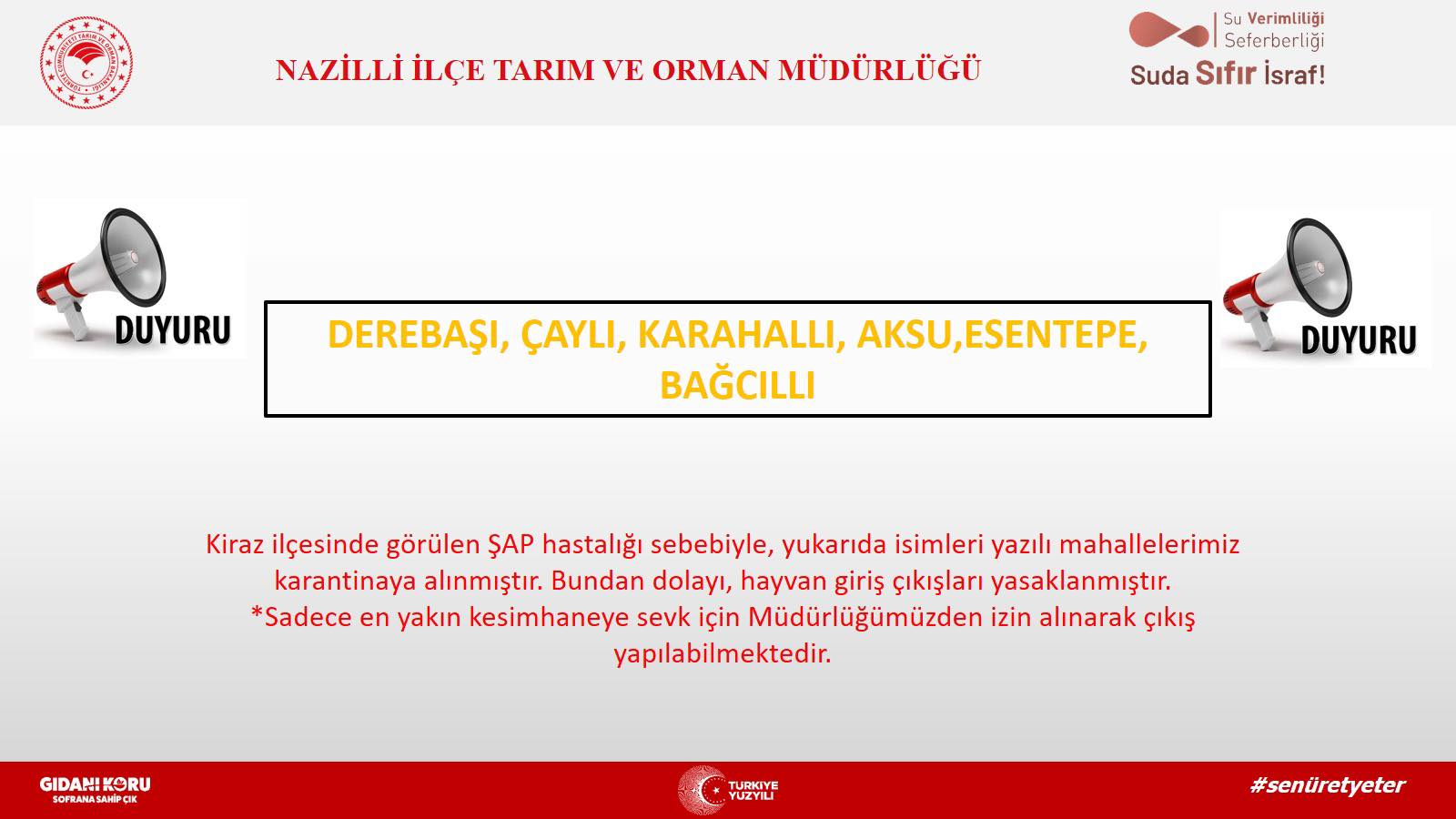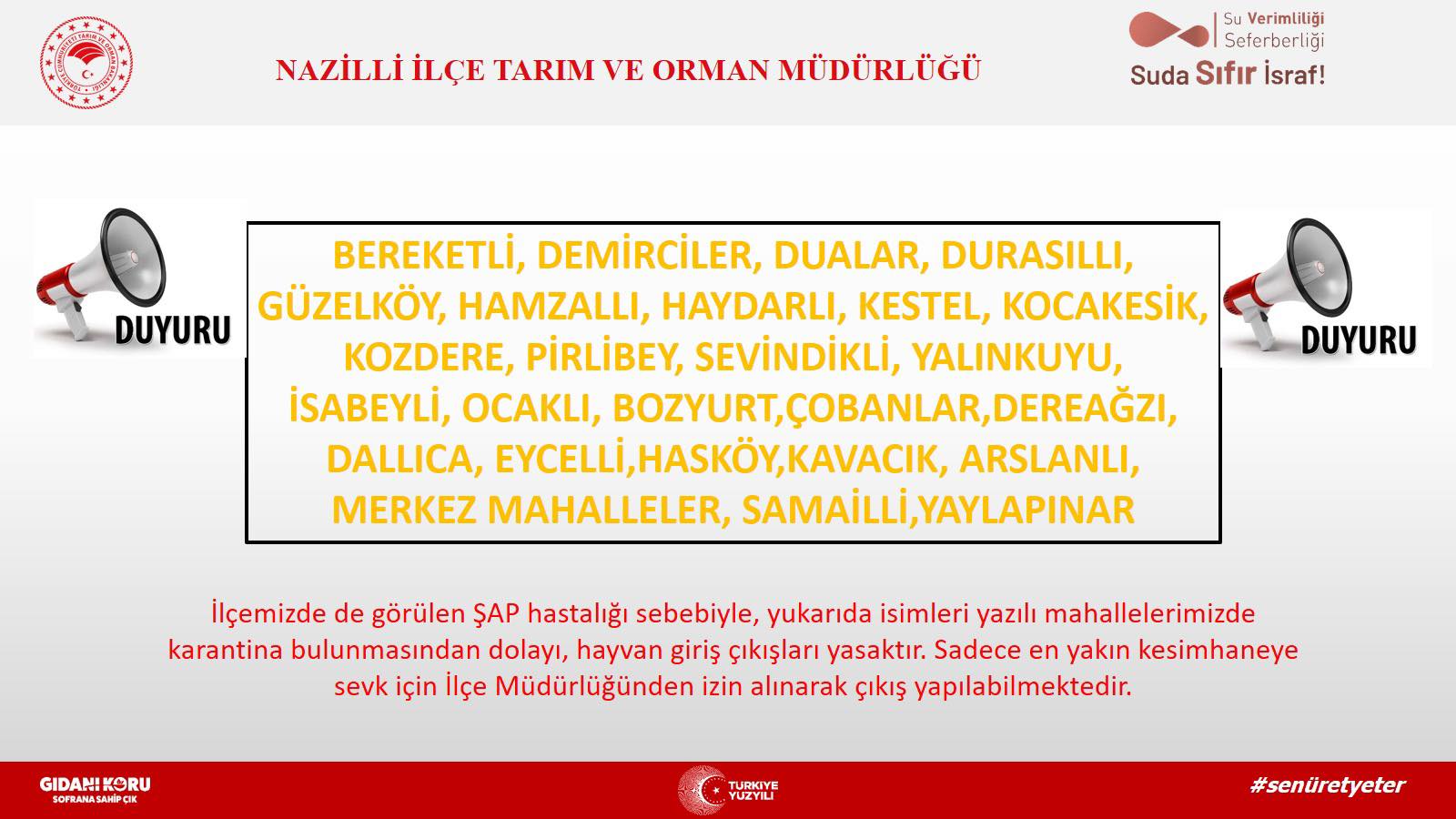 Öte yandan müdürlük tarafından yapılan ek açıklamada İzmir’in Kiraz ilçesinde görülen ŞAP hastalığı nedeniyle Nazilli’nin sınır köyleri olan Derebaşı, Çaylı, Karahallı,Aksu, Esentepe, ve Bağcıllı’da da karantina kararı alındığı belirtildi.