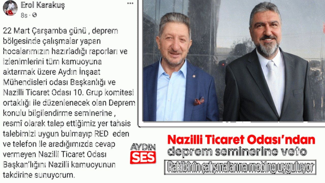 Nazilli Ticaret Odası Yönetim Kurulu Üyesi ve Nazilli Genç İş Adamları Derneği Başkanı (NAZGİAD) Erol Karakuş, sosyal medya hesabından Nazilli Ticaret Odası ile ilgili çarpıcı bir açıklama yaptı. Karakuş yaptığı açıklamada, Aydın İnşaat Mühendisleri Odası Başkanlığı ve üyesi olduğu Nazilli Ticaret Odası 10. Meslek Grubu komite üyeleri ile işbirliğinde yapılacak olan deprem konulu bilgilendirme seminerine yönetimden yer istediğini ama yönetimin yer tahsis etmediğini açıkladı. Bölge için yapılan incelemeler sonucu depremle alakalı kamuoyuna önemli bilgilerin aktarılacağını açıklayan Karakuş, yaklaşık 50 bini aşkın vatandaşımızın hayatını kaybettiği deprem felaketine yönelik yapılacak bilgilendirme semineri için yer tahsisi yapılmamasına sosyal medyadan tepki gösterdi.