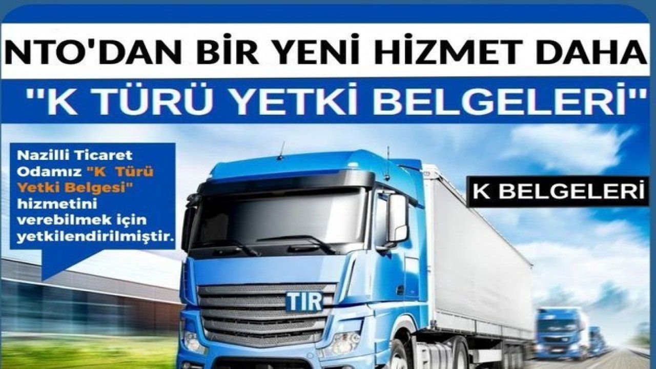 Ulaştırma Bakanlığı ve Türkiye Odalar ve Borsalar Birliği (TOBB) nezdinde yapılan görüşmeler sonunda Nazilli Ticaret Odası (NTO), yurtiçi eşya taşımacılığı veya hususi taşımacılık için gerekli olan K1, K2 ve K3 belgelerini veren yetkili odalar arasına dahil edildi. Nazilli Ticaret Odası’nın yetki alanı içindeki Nazilli, Buharkent, Bozdoğan, Karacasu, Kuyucak, Sultanhisar ve Yenipazar ilçelerinde işyeri adresi bulunan gerçek veya tüzel kişilerin K türü yetki belgesi işlemleri NTO tarafından yapılabilecek.