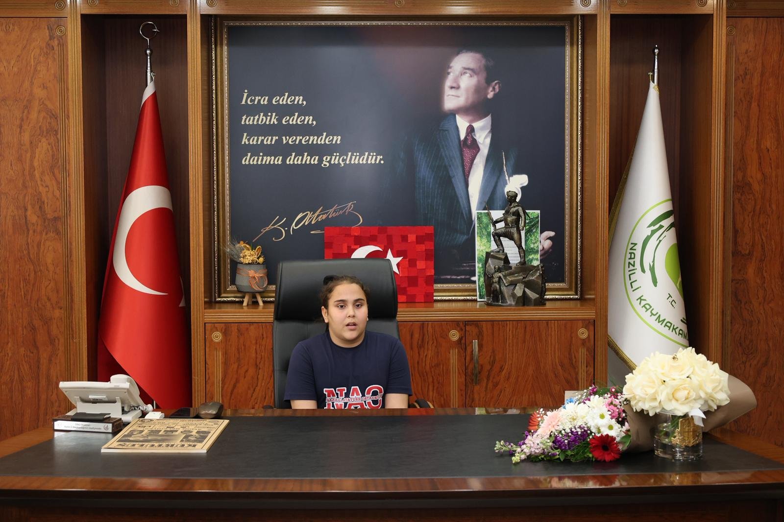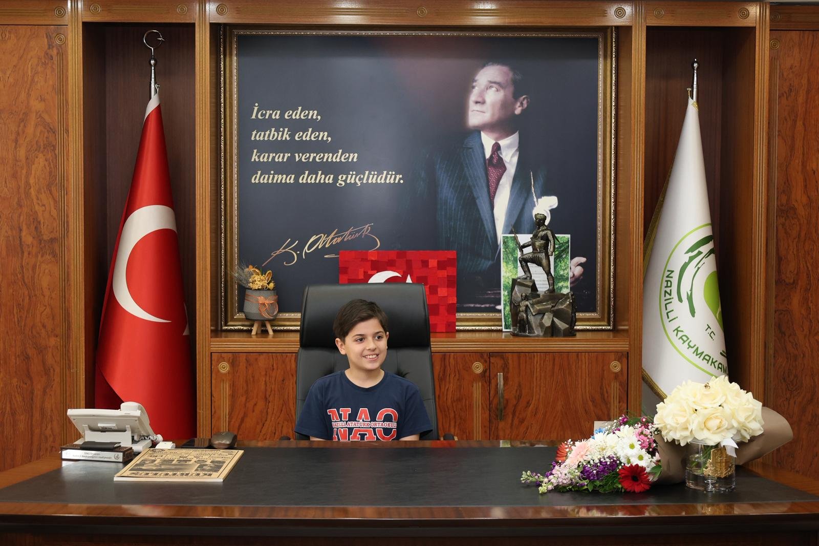 Aydın’ın Nazilli ilçesinde, 23 Nisan Ulusal Egemenlik ve Çocuk Bayramı’nın 106. yılı kapsamında anlamlı bir devir teslim töreni gerçekleştirildi. Nazilli Kaymakamı Huriye Küpeli Kan, kaymakamlık makamını temsili olarak Nazilli Atatürk Ortaokulu 5. sınıf öğrencileri Sinan Babacan ve Ayşe Sena Çulluca’ya devretti.