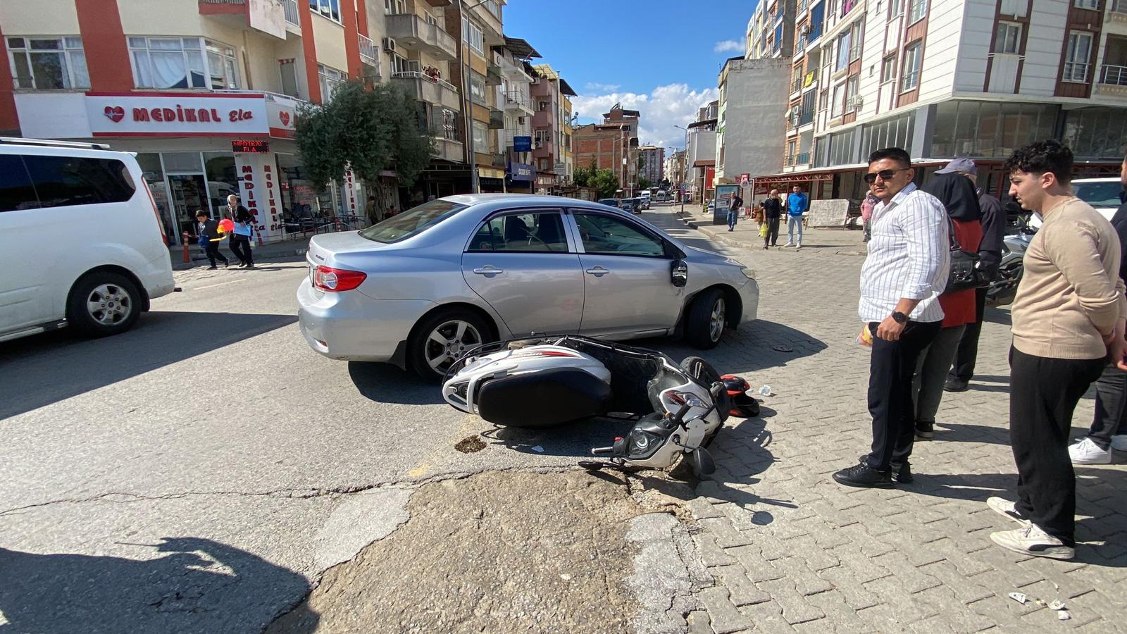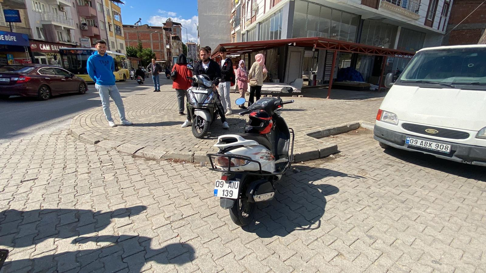 Edinilen bilgiye göre; A.E. idaresindeki 09 AIU 139 plakalı motosiklet, 372 sokağa dönüş yapmak isteyen H.K. yönetimindeki 09 FD 327 plakalı otomobile çarptı.