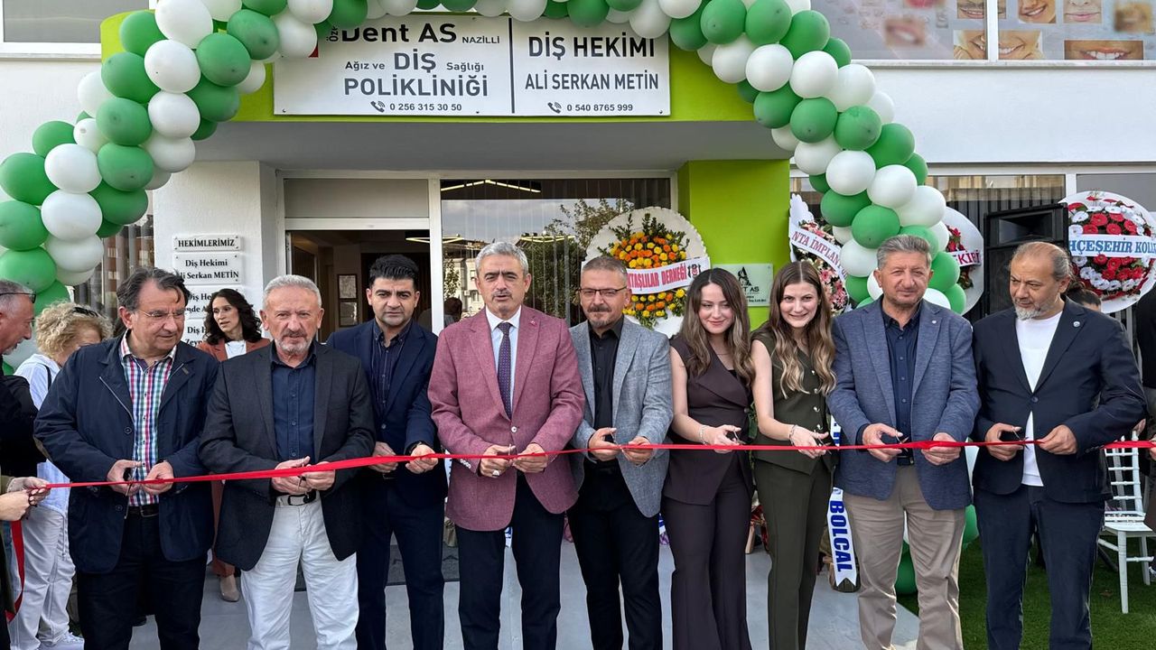 Uzman Diş Hekimi Ali Serkan Metin tarafından kurulan Dent AS Polikliniği’nin açılış törenine; MHP Aydın İl Başkanı Haluk Alıcık, Nazilli Belediye Başkan Yardımcısı Selahattin Yılmaz, MHP Nazilli İlçe Başkanı Hasan Eren, Nazilli Ticaret Odası Başkanı Nuri Arslan, Belediye Meclis Üyesi Gürel Çırpanlı, iş insanları ve çok sayıda davetli katıldı.