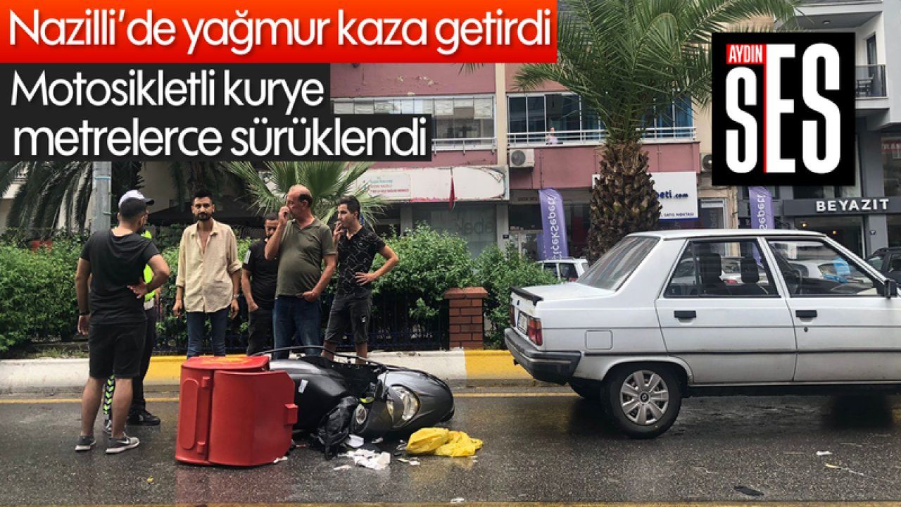 Aydın’ın Nazilli ilçesinde sağanak yağış kaza getirdi. Metrelerce sürüklenen kurye aracın altına girdi.