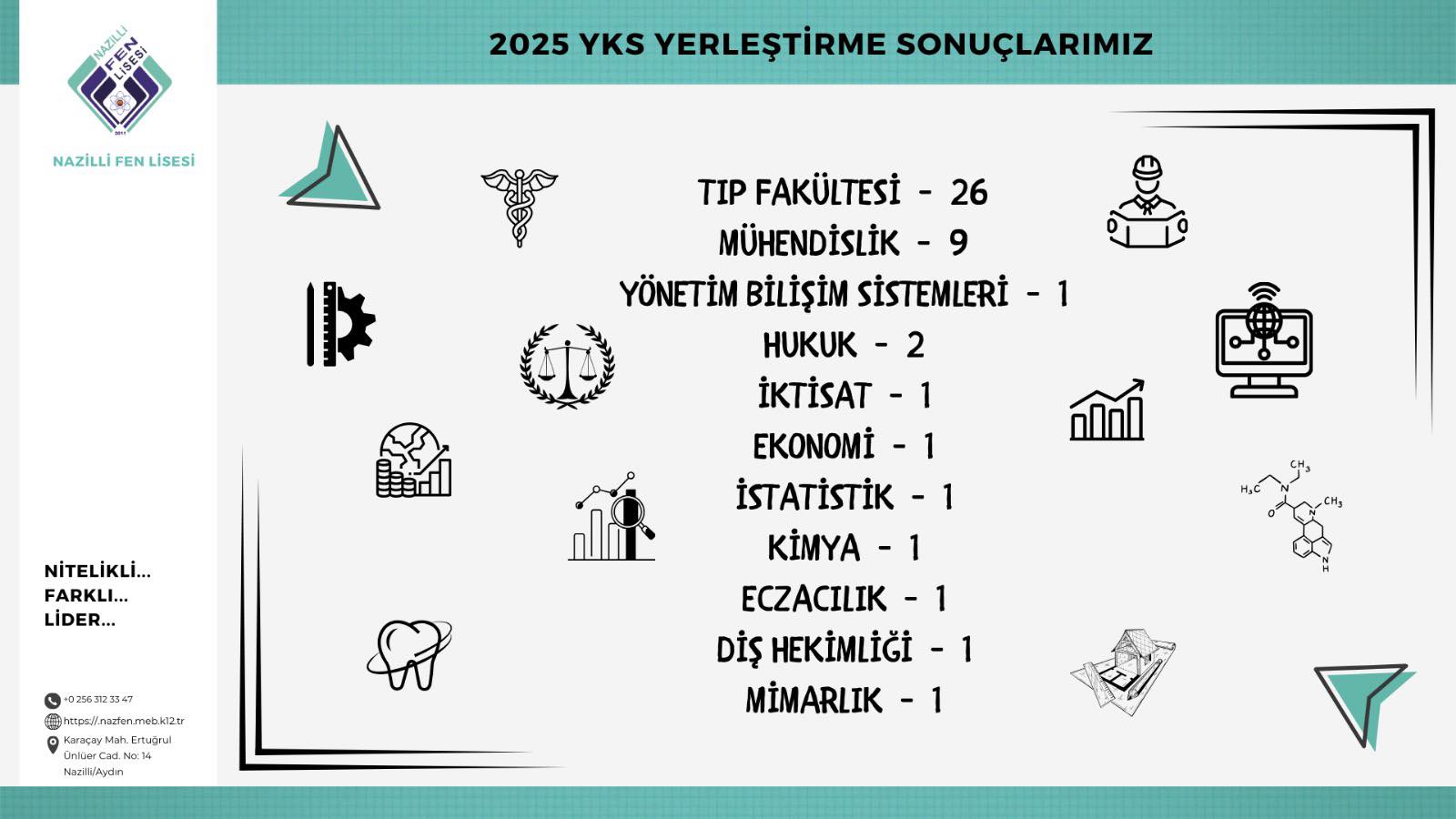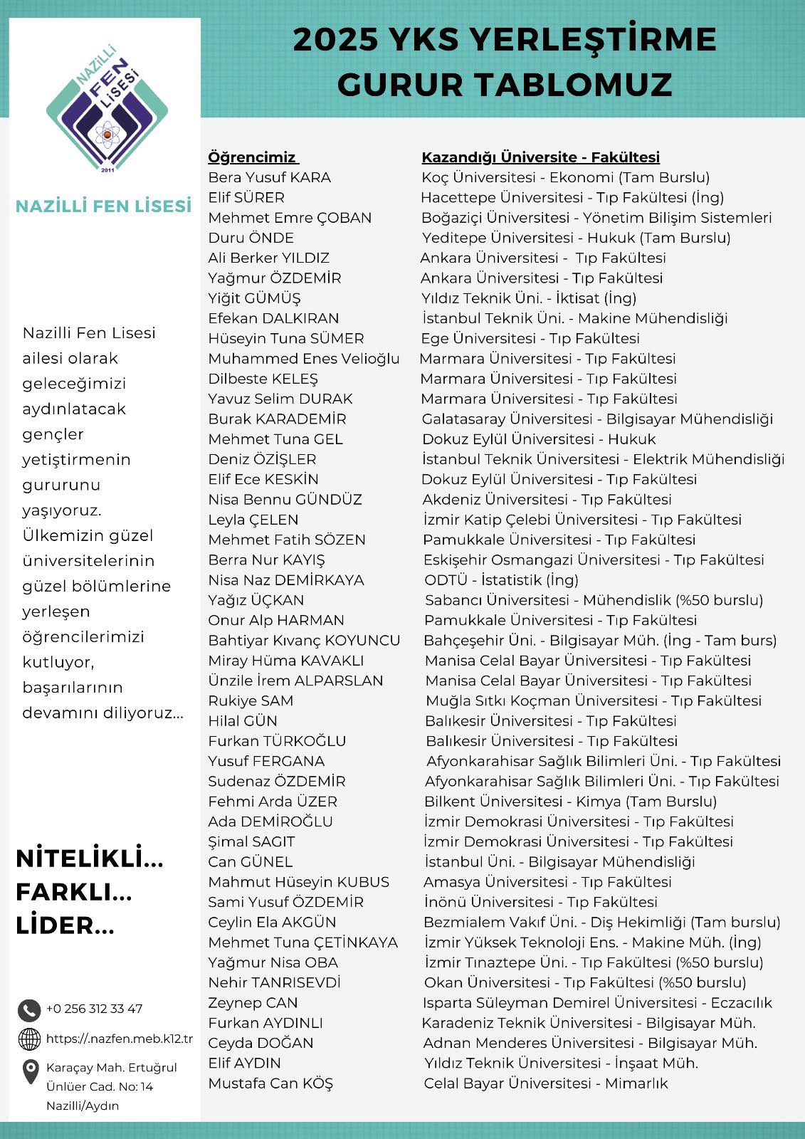 Nazilli Fen Lisesi öğrencileri, 2025 YKS yerleştirme sonuçlarıyla Türkiye’nin saygın üniversitelerine girerek önemli bir başarıya imza attı. Koç, Boğaziçi, ODTÜ, Bilkent, Hacettepe, Ankara, Marmara, Ege ve Yeditepe gibi köklü üniversitelerin prestijli bölümlerine yerleşen öğrenciler, ilçede gurur kaynağı oldu.
