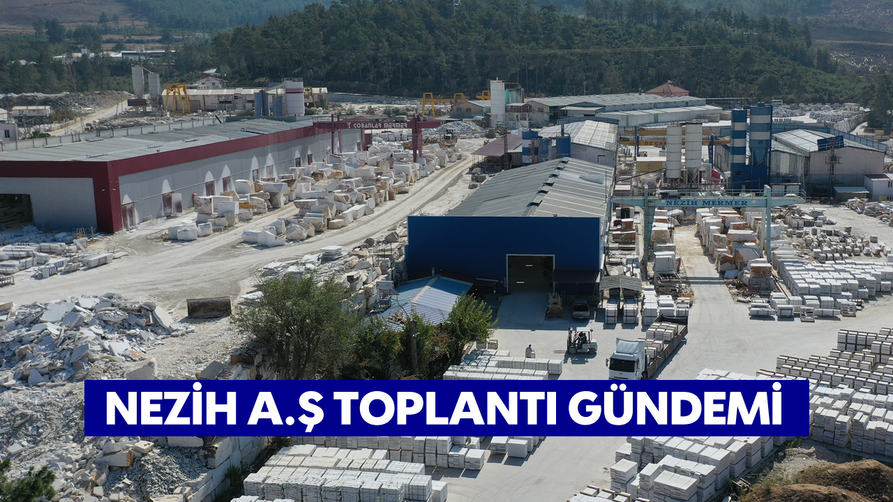 Nezih Mermer Madencilik İnşaat Yapı Elemanları Makine Turizm Seyahat Gıda Tarım ve Orman Ürünleri Nakliyat Petrol Ürünleri Neşriyat Sanayi ve Ticaret A.Ş.nin 2024 yılı olağan Genel kurulunda aşağıdaki gündem maddelerini görüşmek üzere 06/10/2025 tarihinde saat 10:30 da Hasan Efendi Mahallesi 1904 Sokak No:26 AYDIN adresinde yapılmasına karar verilmiştir.GÜNDEM :